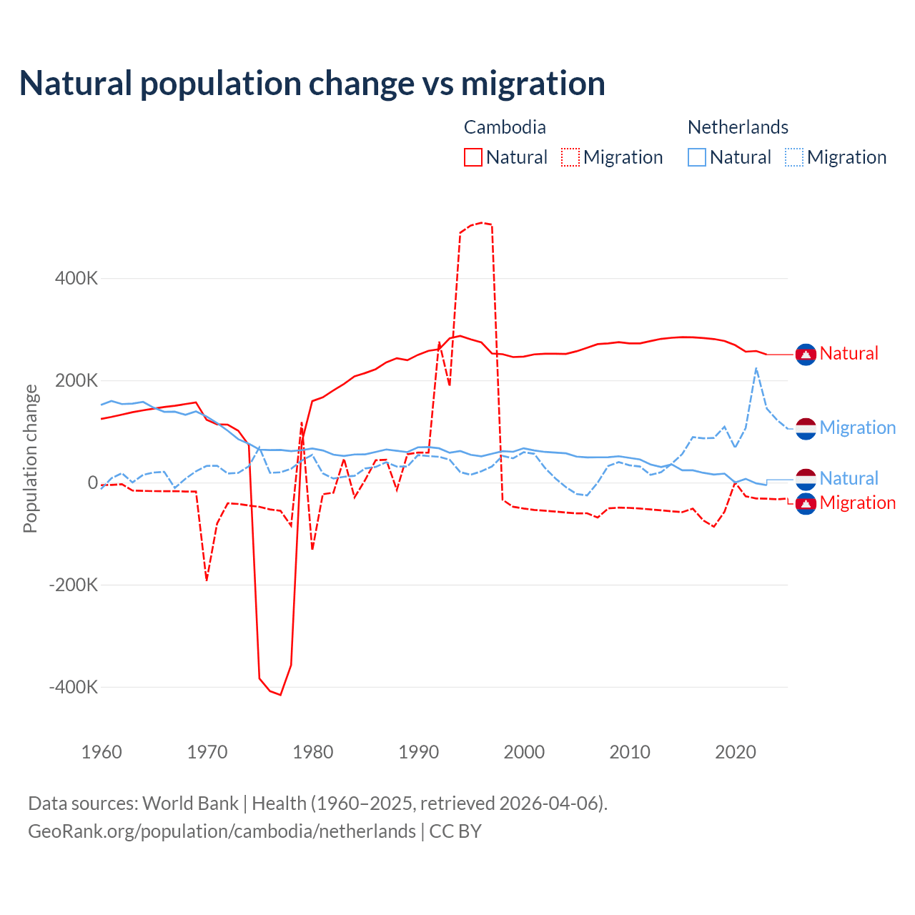 Over the last 10 years, 85.2% of the population change in Cambodia is from natural causes (a gain of 2,724,147 people) and 14.8% is from migration (a loss of 474,505 people). In the Netherlands 11.8% is from natural causes (a gain of 134,554 people) and 88.2% is from migration (a gain of 1,006,495 people).