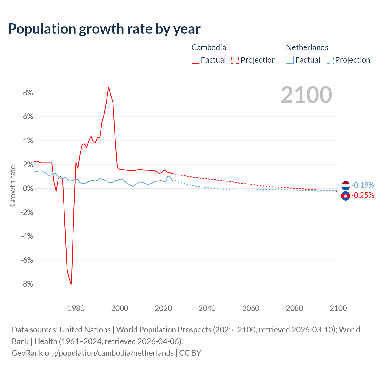 - For the last 10 years, Cambodia has had an average growth rate of +1.38% per year vs +0.62% in the Netherlands.