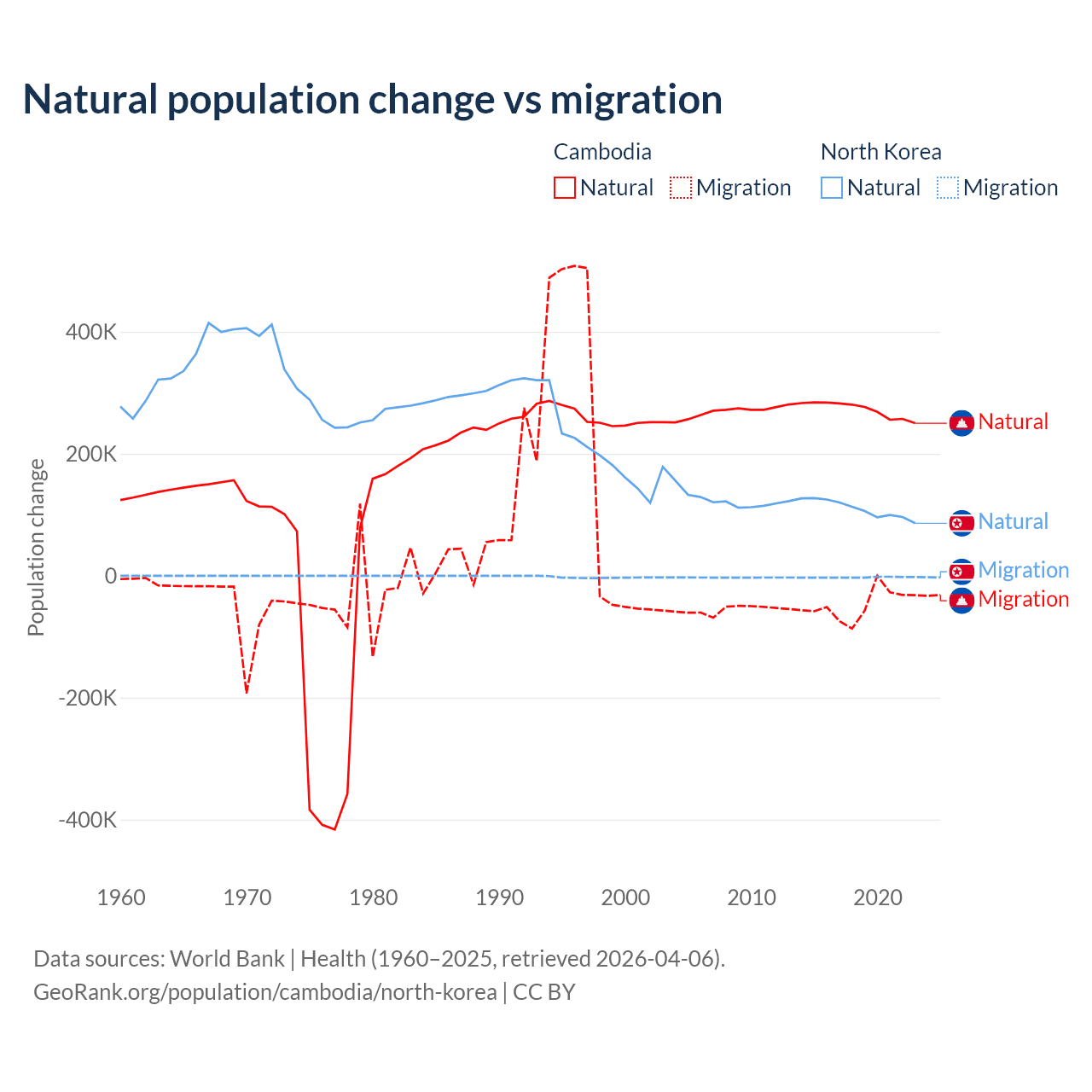 Over the last 10 years, 85.2% of the population change in Cambodia is from natural causes (a gain of 2,724,147 people) and 14.8% is from migration (a loss of 474,505 people). In North Korea 97.7% is from natural causes (a gain of 1,097,372 people) and 2.33% is from migration (a loss of 26,227 people).