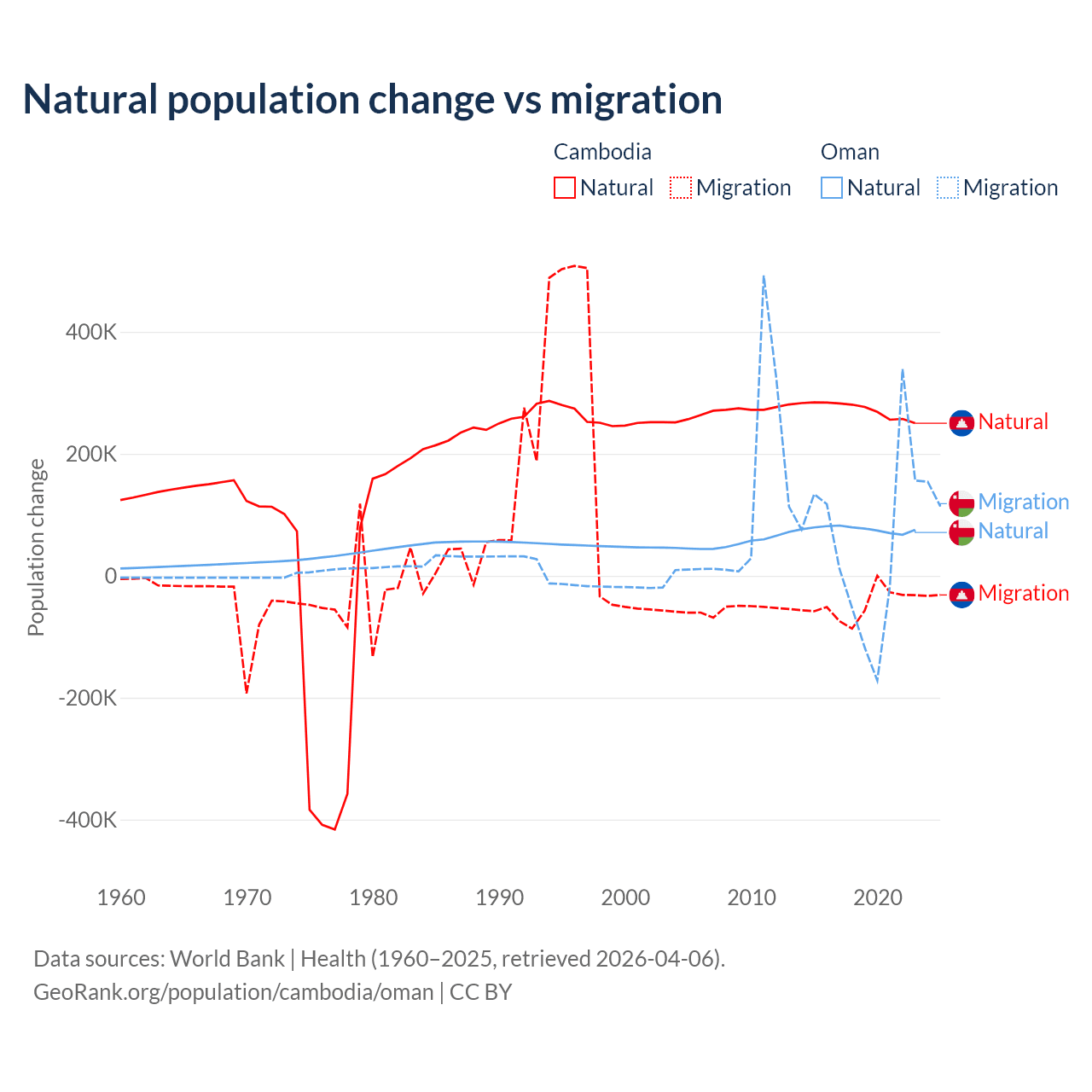 Over the last 10 years, 85.2% of the population change in Cambodia is from natural causes (a gain of 2,724,147 people) and 14.8% is from migration (a loss of 474,505 people). In Oman 61.6% is from natural causes (a gain of 763,049 people) and 38.4% is from migration (a gain of 475,565 people).