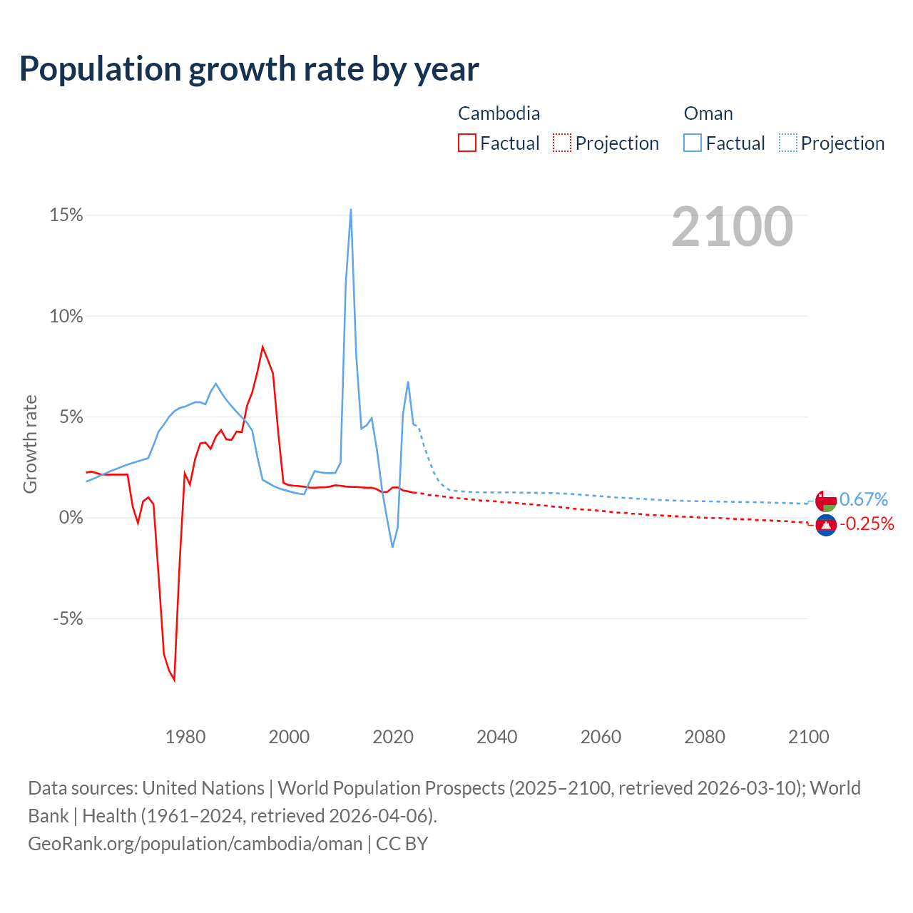 - For the last 10 years, Cambodia has had an average growth rate of +1.38% per year vs +2.99% in Oman.