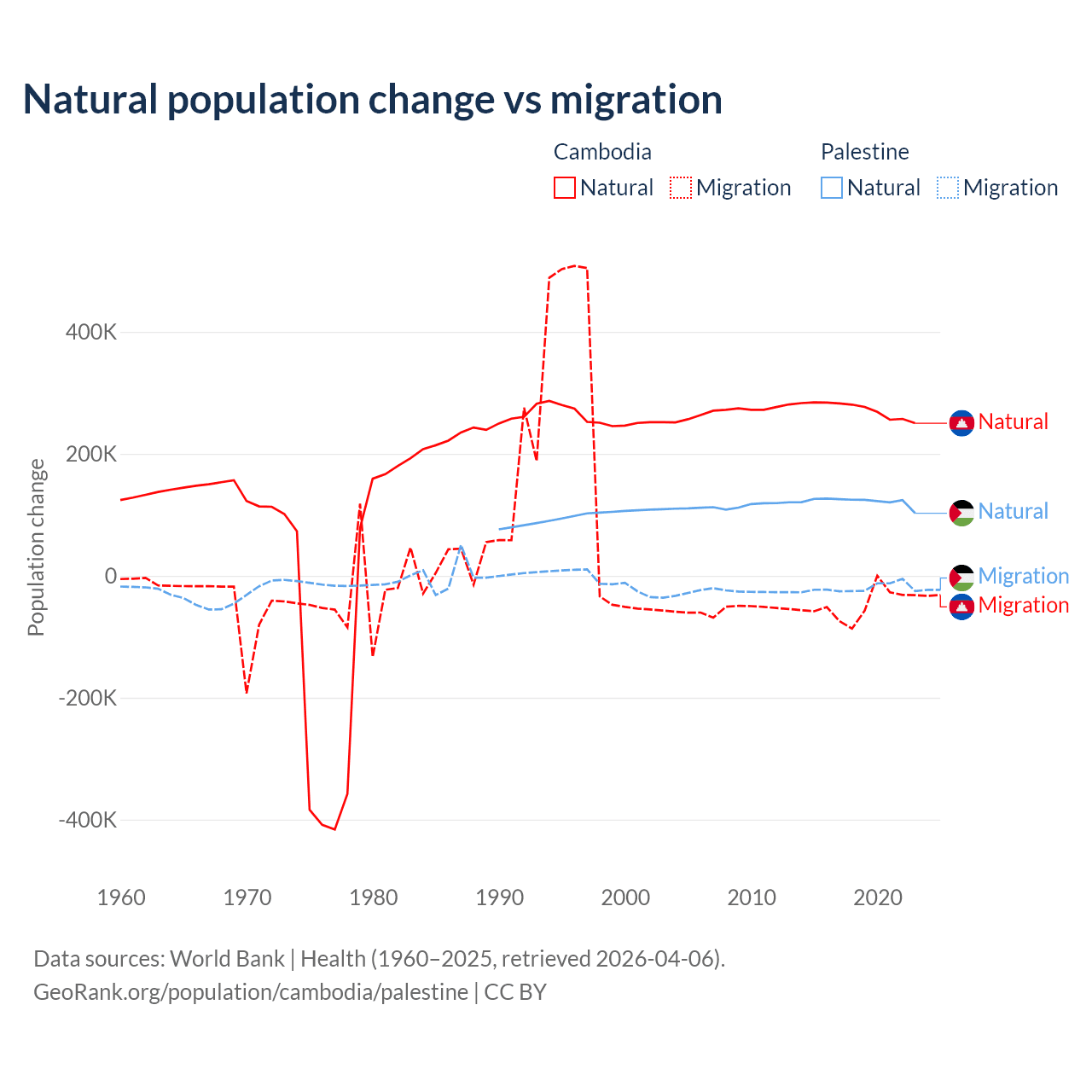 Over the last 10 years, 85.2% of the population change in Cambodia is from natural causes (a gain of 2,724,147 people) and 14.8% is from migration (a loss of 474,505 people). In Palestine 85.7% is from natural causes (a gain of 1,218,010 people) and 14.3% is from migration (a loss of 202,820 people).