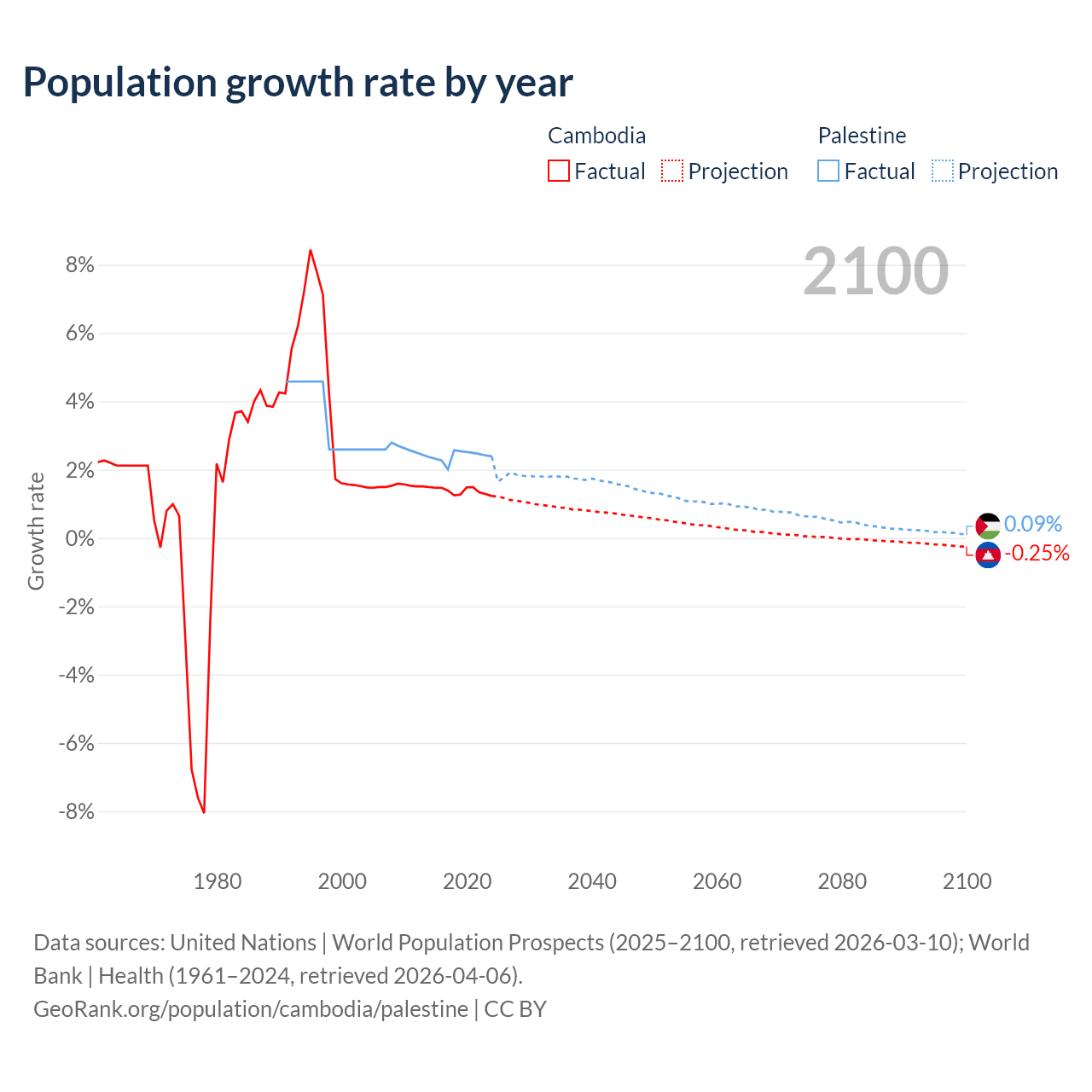 - For the last 10 years, Cambodia has had an average growth rate of +1.38% per year vs +2.4% in Palestine.