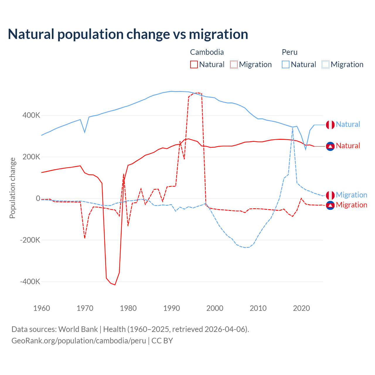 Over the last 10 years, 85.2% of the population change in Cambodia is from natural causes (a gain of 2,724,147 people) and 14.8% is from migration (a loss of 474,505 people). In Peru 82% is from natural causes (a gain of 3,345,822 people) and 18% is from migration (a gain of 732,505 people).