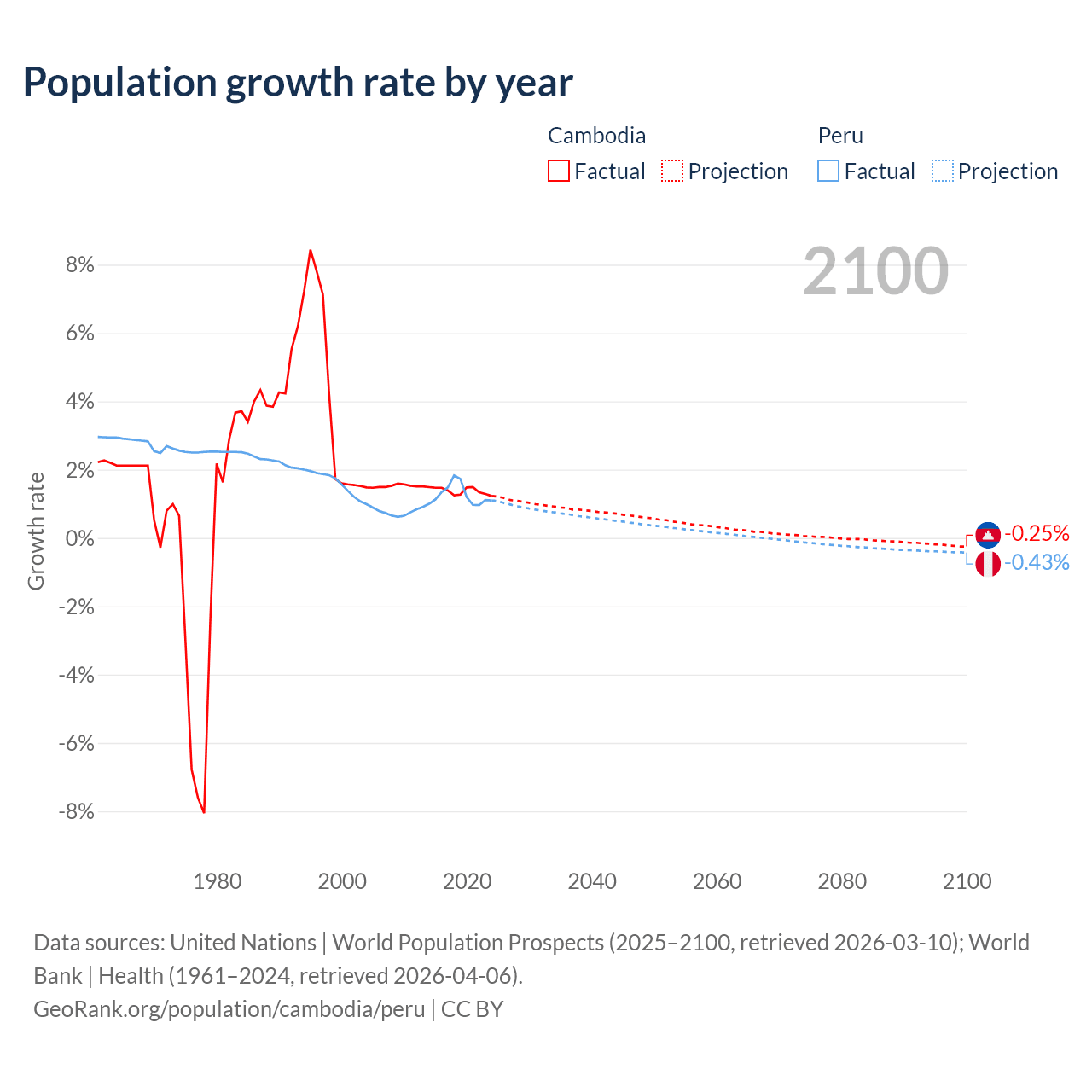 - For the last 10 years, Cambodia has had an average growth rate of +1.38% per year vs +1.26% in Peru.