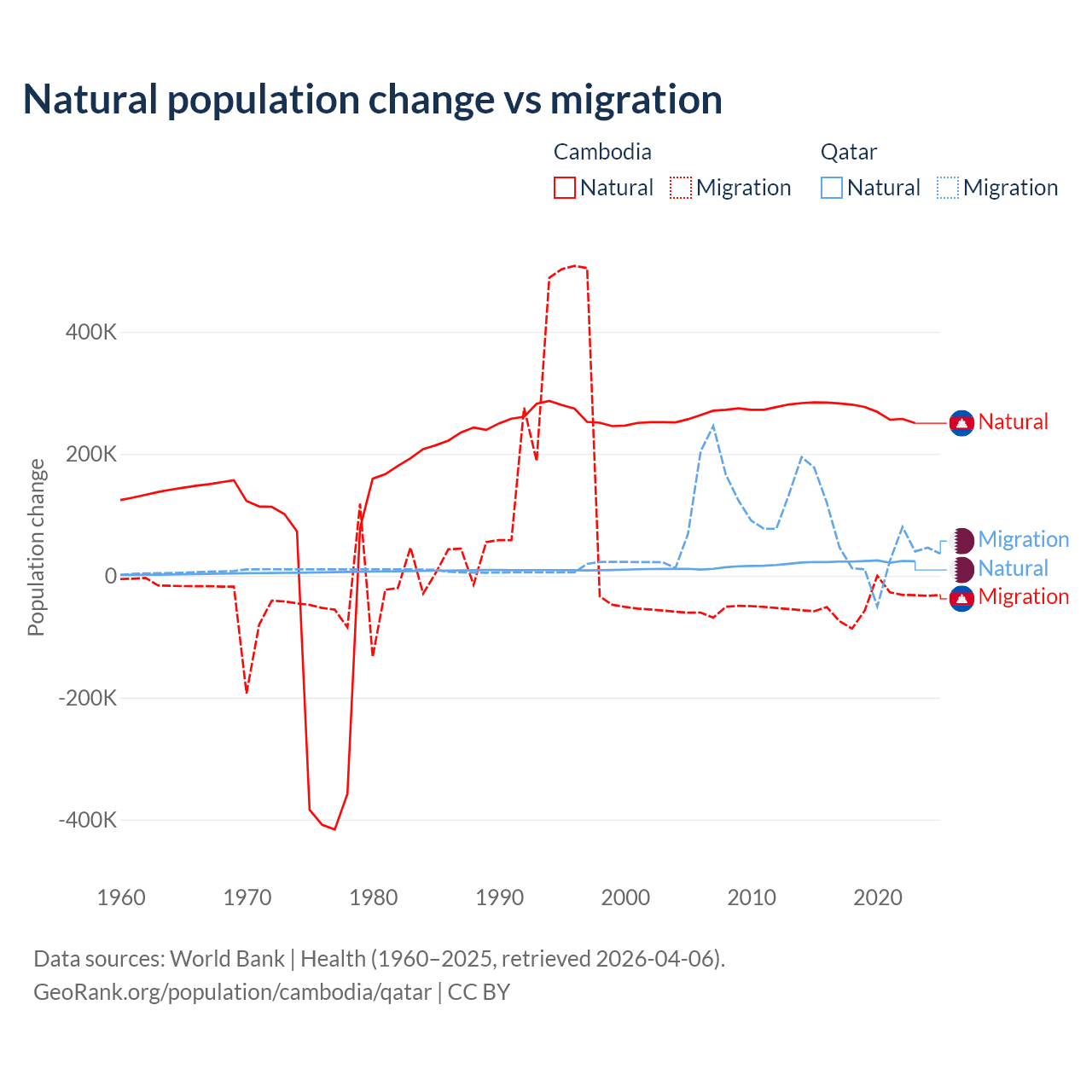 Over the last 10 years, 85.2% of the population change in Cambodia is from natural causes (a gain of 2,724,147 people) and 14.8% is from migration (a loss of 474,505 people). In Qatar 26.1% is from natural causes (a gain of 232,009 people) and 73.9% is from migration (a gain of 655,712 people).
