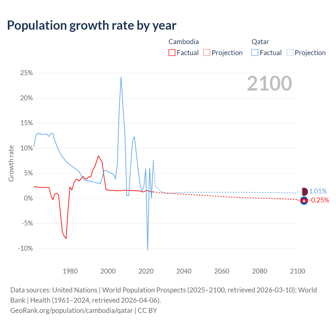 - For the last 10 years, Cambodia has had an average growth rate of +1.38% per year vs +3.86% in Qatar.