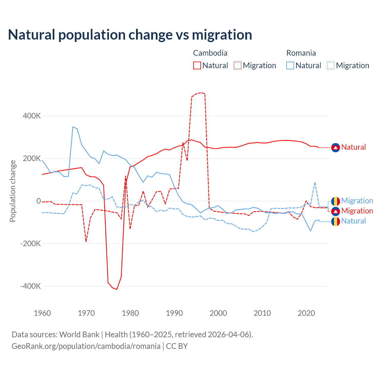 Over the last 10 years, 85.2% of the population change in Cambodia is from natural causes (a gain of 2,724,147 people) and 14.8% is from migration (a loss of 474,505 people). In Romania 82% is from natural causes (a loss of 766,295 people) and 18% is from migration (a loss of 167,917 people).