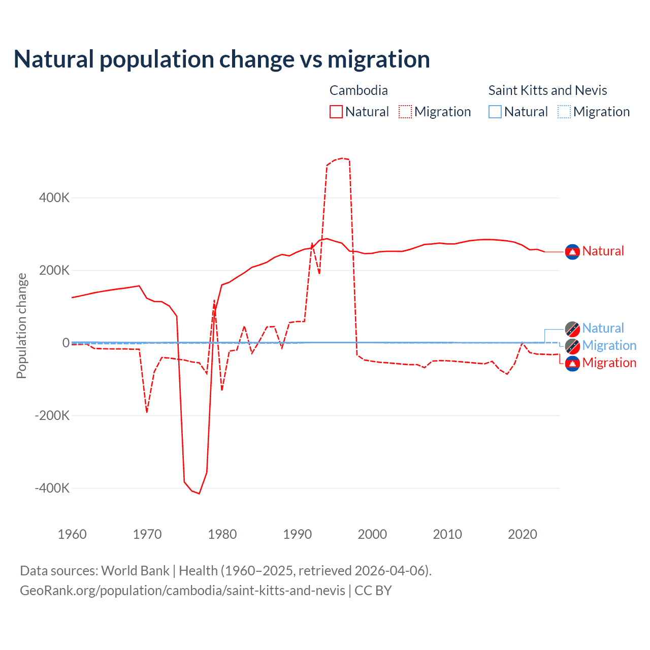 Over the last 10 years, 85.2% of the population change in Cambodia is from natural causes (a gain of 2,724,147 people) and 14.8% is from migration (a loss of 474,505 people). In Saint Kitts and Nevis 44.9% is from natural causes (a gain of 1,225 people) and 55.1% is from migration (a loss of 1,506 people).