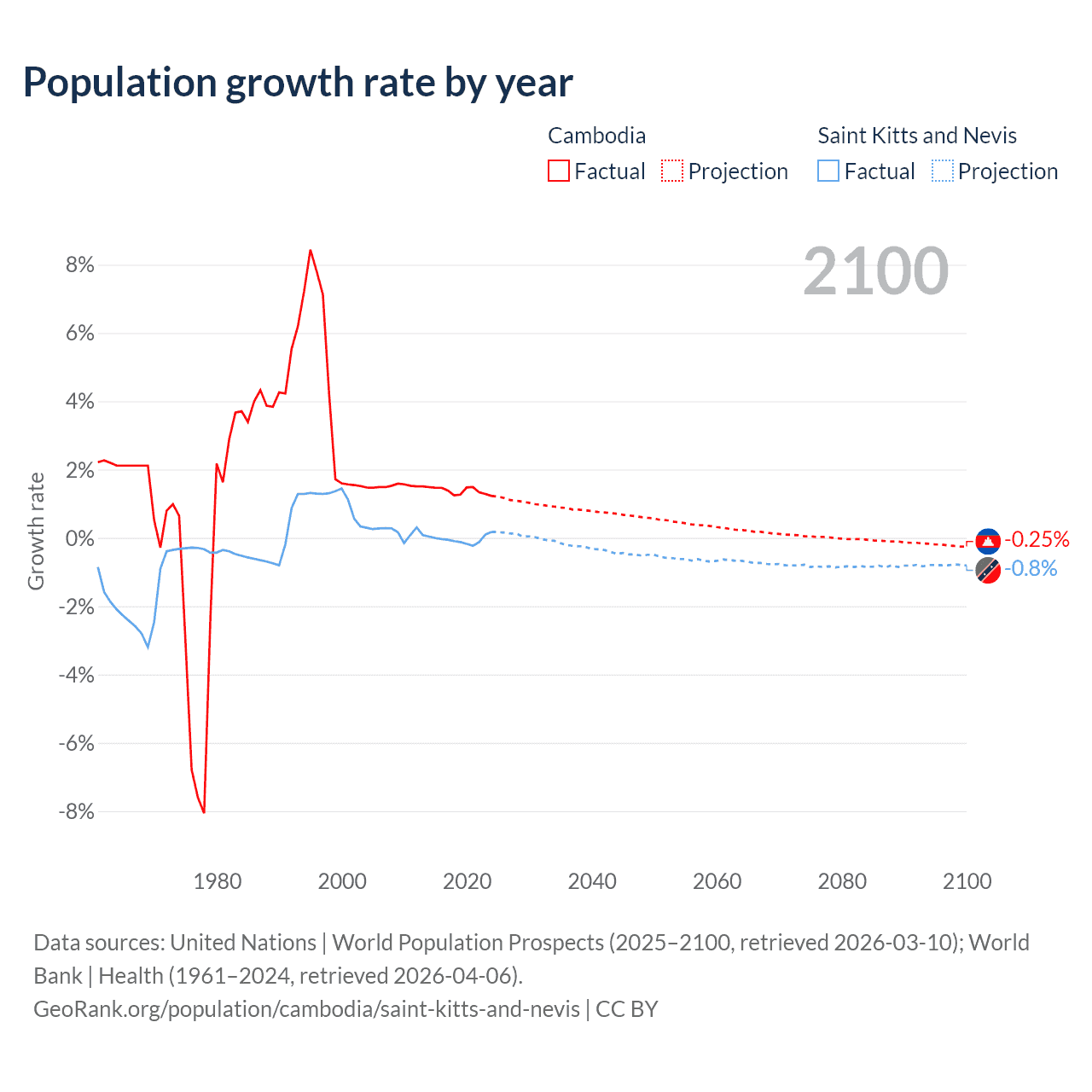 - For the last 10 years, Cambodia has had an average growth rate of +1.38% per year vs -0.04% in Saint Kitts and Nevis.