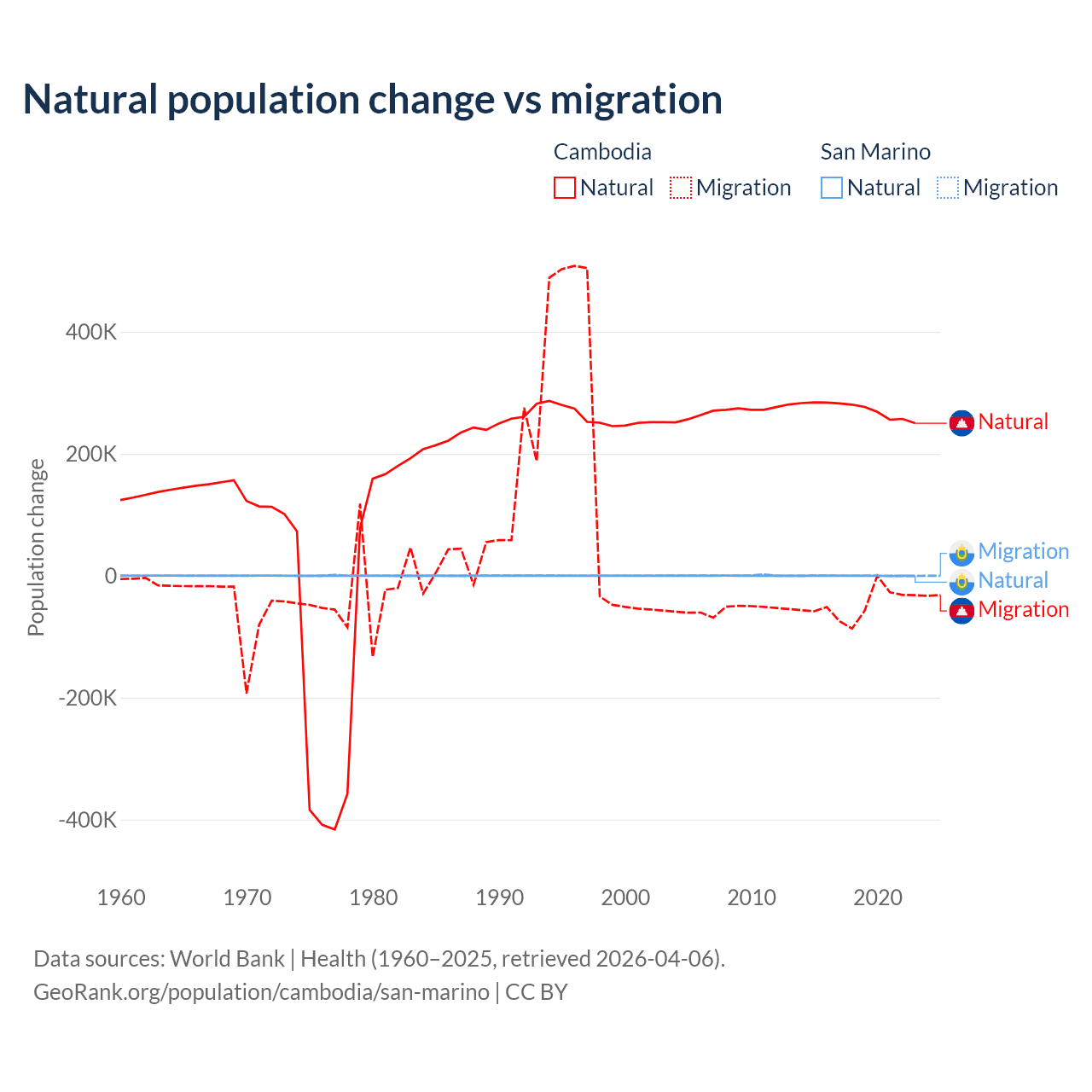 Over the last 10 years, 85.2% of the population change in Cambodia is from natural causes (a gain of 2,724,147 people) and 14.8% is from migration (a loss of 474,505 people). In San Marino 40.9% is from natural causes (a loss of 358 people) and 59.1% is from migration (a gain of 517 people).