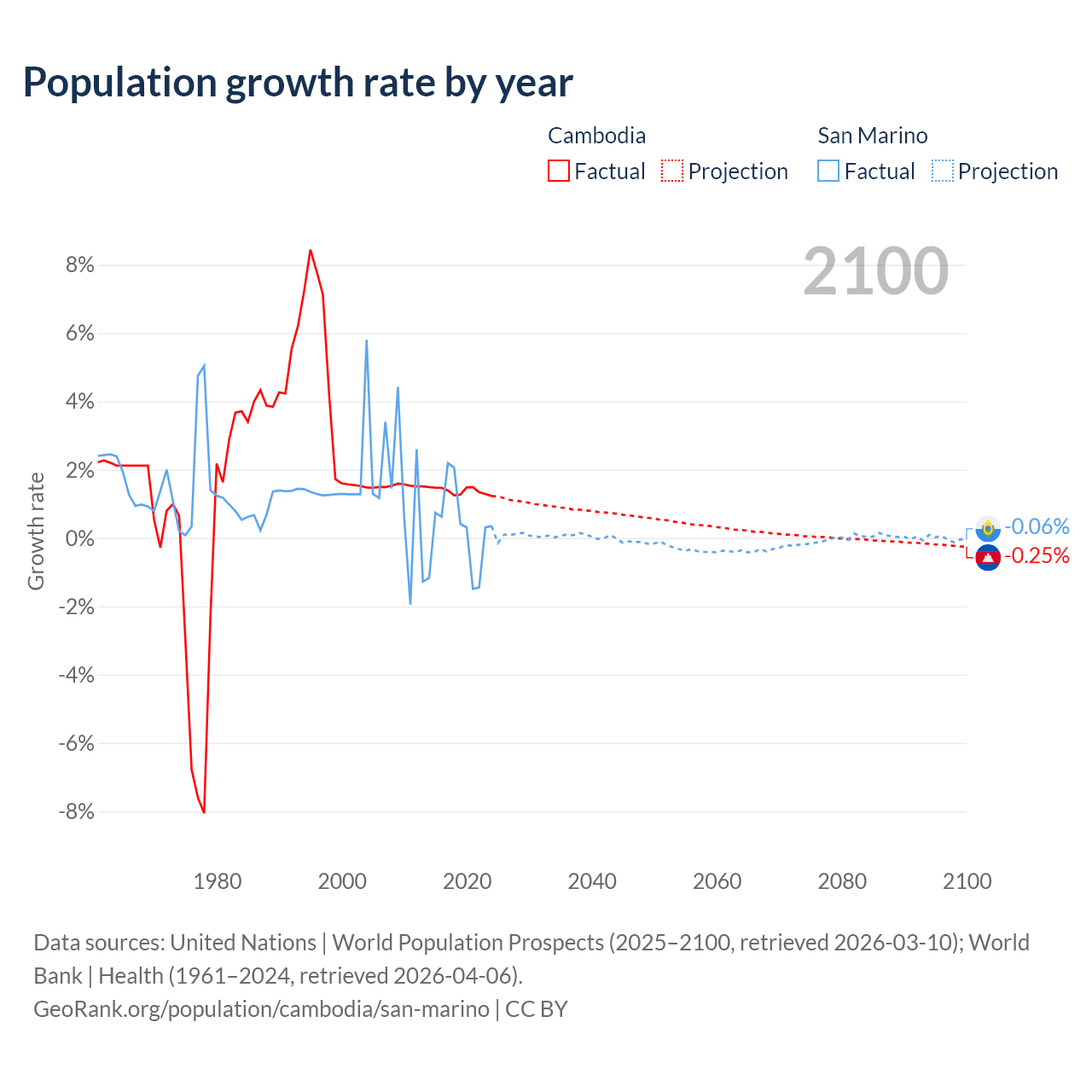 - For the last 10 years, Cambodia has had an average growth rate of +1.38% per year vs +0.26% in San Marino.