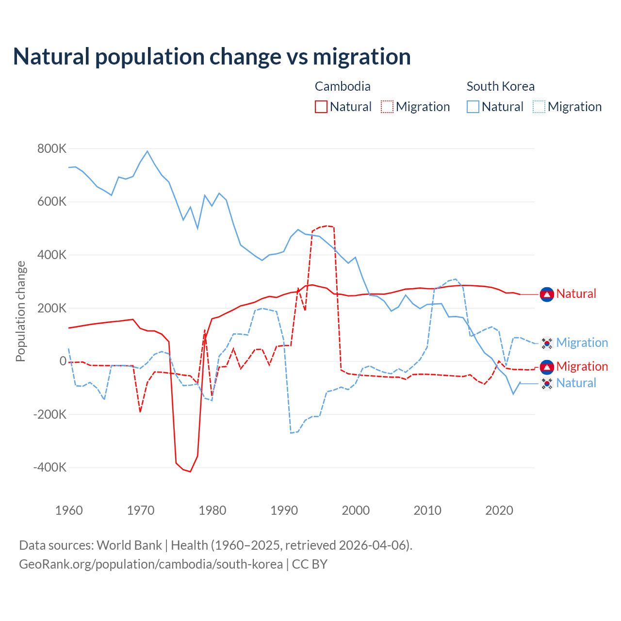 Over the last 10 years, 85.2% of the population change in Cambodia is from natural causes (a gain of 2,724,147 people) and 14.8% is from migration (a loss of 474,505 people). In South Korea 17.6% is from natural causes (a gain of 277,215 people) and 82.4% is from migration (a gain of 1,298,356 people).