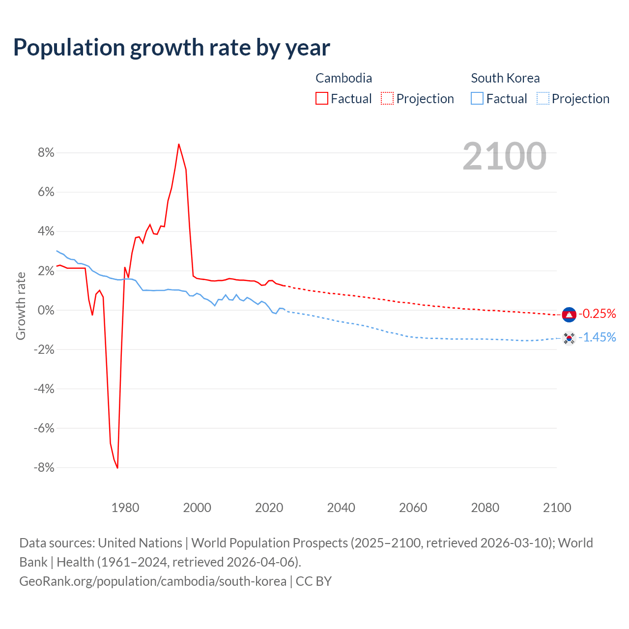 - For the last 10 years, Cambodia has had an average growth rate of +1.38% per year vs +0.24% in South Korea.