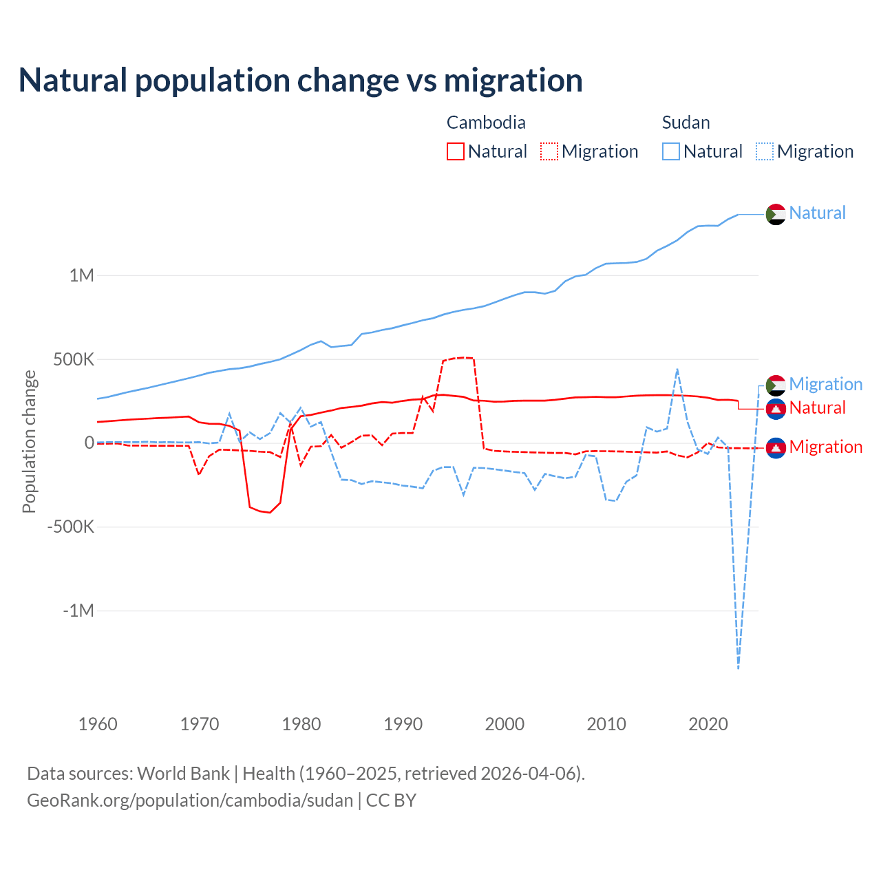 Over the last 10 years, 85.2% of the population change in Cambodia is from natural causes (a gain of 2,724,147 people) and 14.8% is from migration (a loss of 474,505 people). In Sudan 95.1% is from natural causes (a gain of 12,459,977 people) and 4.88% is from migration (a loss of 639,596 people).