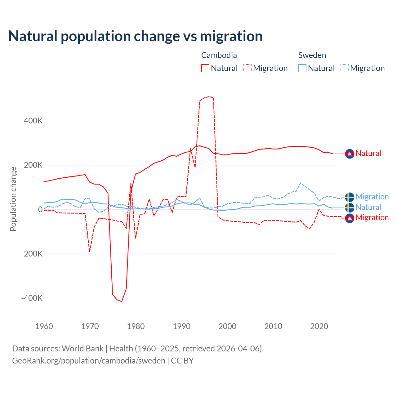Over the last 10 years, 85.2% of the population change in Cambodia is from natural causes (a gain of 2,724,147 people) and 14.8% is from migration (a loss of 474,505 people). In Sweden 21.4% is from natural causes (a gain of 201,900 people) and 78.6% is from migration (a gain of 743,642 people).