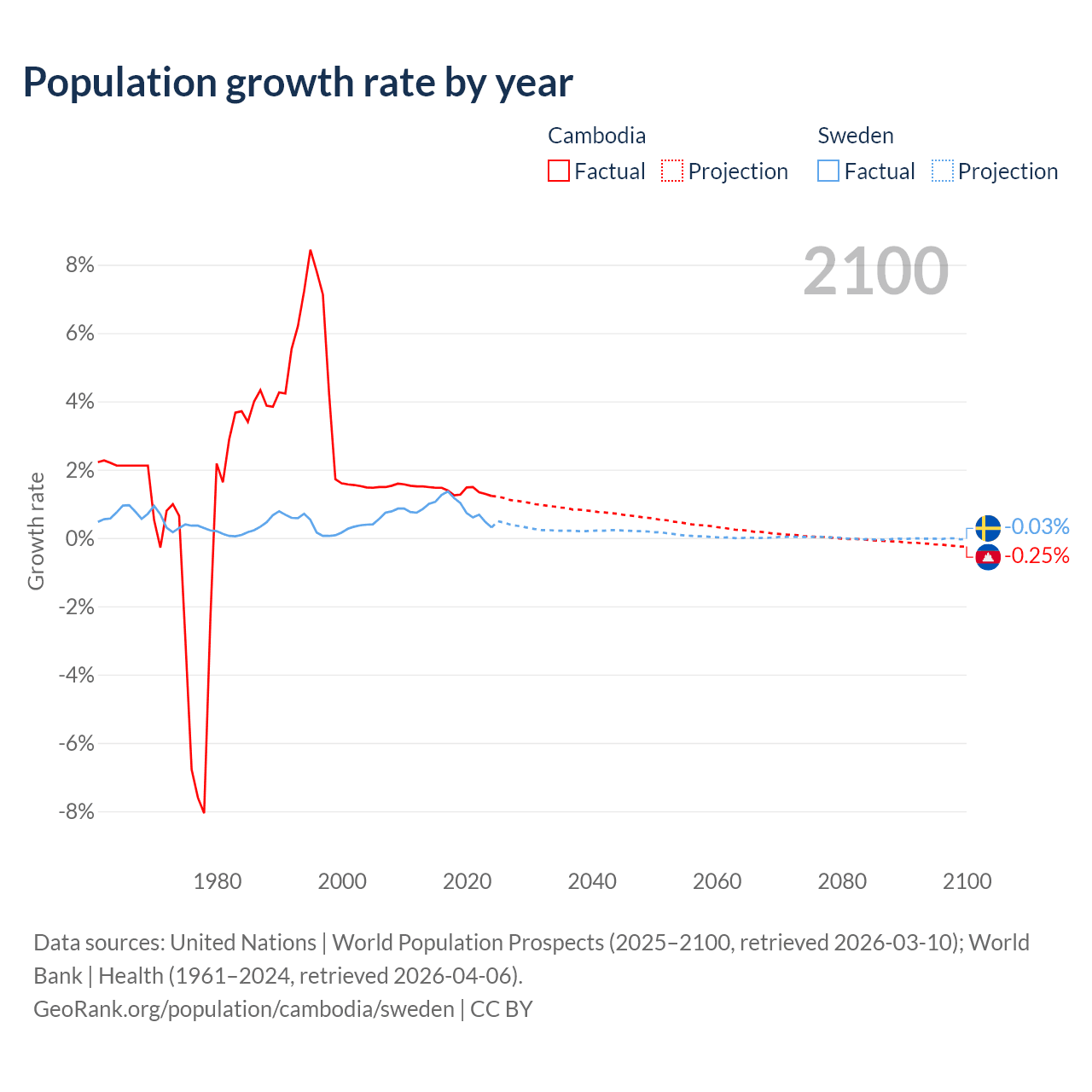 - For the last 10 years, Cambodia has had an average growth rate of +1.38% per year vs +0.88% in Sweden.