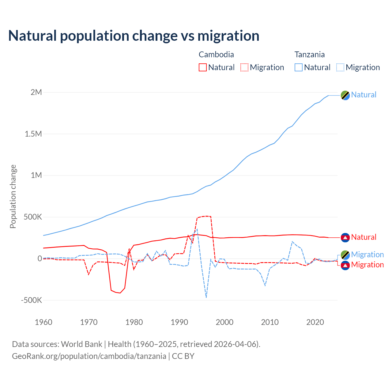 Over the last 10 years, 85.2% of the population change in Cambodia is from natural causes (a gain of 2,724,147 people) and 14.8% is from migration (a loss of 474,505 people). In Tanzania 98.7% is from natural causes (a gain of 17,769,541 people) and 1.27% is from migration (a gain of 229,466 people).