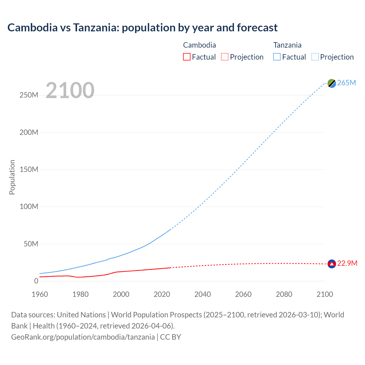 Cambodia vs Tanzania: population by year and forecast