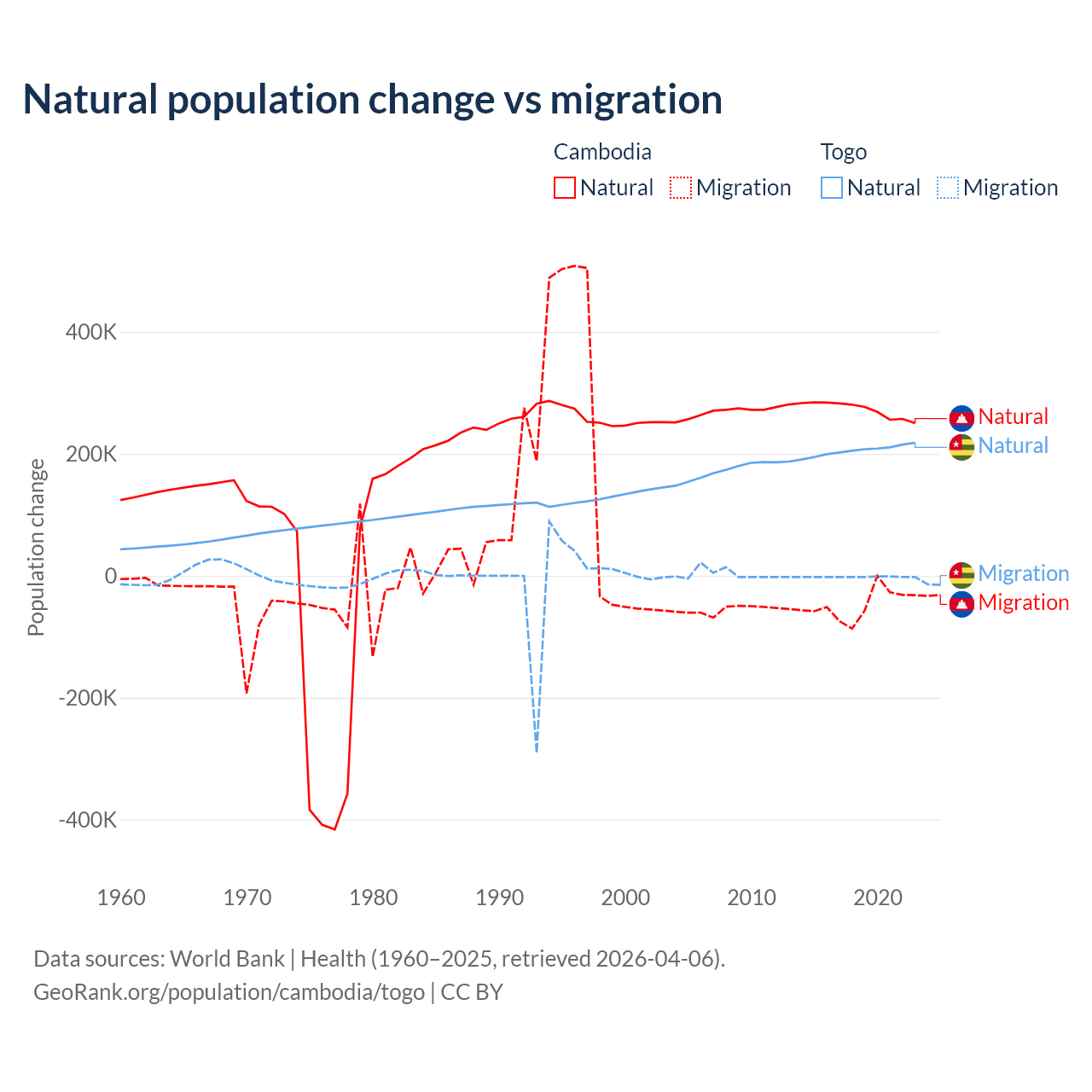 Over the last 10 years, 85.2% of the population change in Cambodia is from natural causes (a gain of 2,724,147 people) and 14.8% is from migration (a loss of 474,505 people). In Togo 99.1% is from natural causes (a gain of 2,052,115 people) and 0.86% is from migration (a loss of 17,852 people).