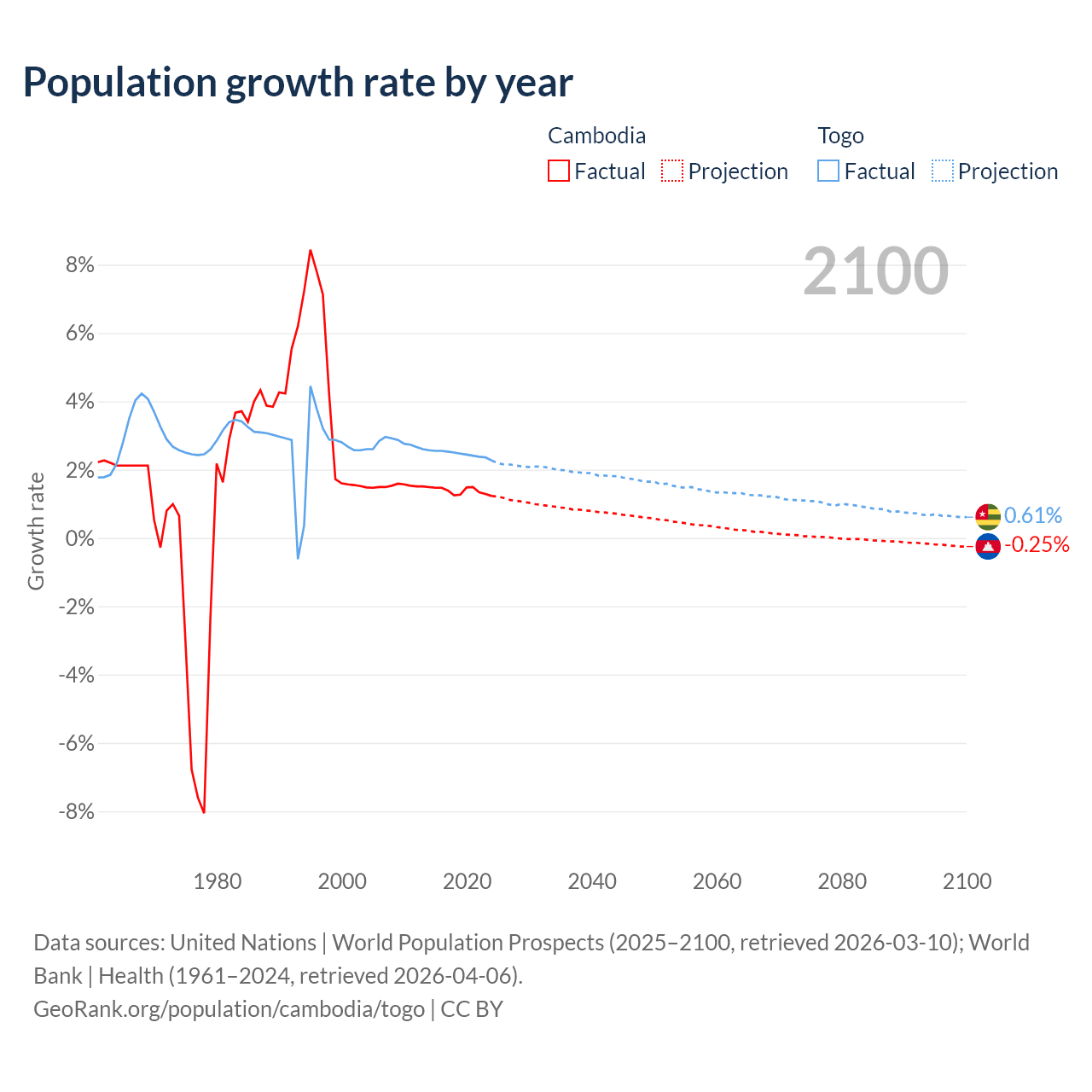 - For the last 10 years, Cambodia has had an average growth rate of +1.38% per year vs +2.46% in Togo.