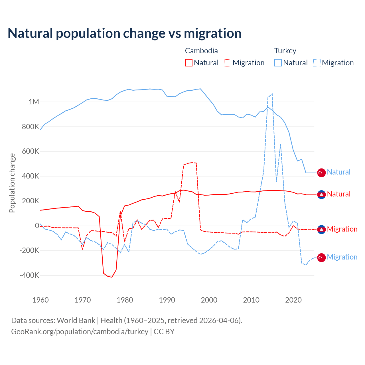 Over the last 10 years, 85.2% of the population change in Cambodia is from natural causes (a gain of 2,724,147 people) and 14.8% is from migration (a loss of 474,505 people). In Turkey 73% is from natural causes (a gain of 7,333,352 people) and 27% is from migration (a gain of 2,718,916 people).