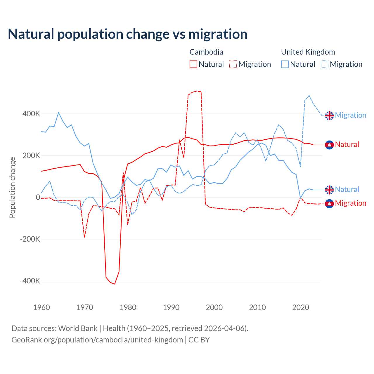 Over the last 10 years, 85.2% of the population change in Cambodia is from natural causes (a gain of 2,724,147 people) and 14.8% is from migration (a loss of 474,505 people). In the United Kingdom 23.9% is from natural causes (a gain of 1,033,129 people) and 76.1% is from migration (a gain of 3,283,101 people).
