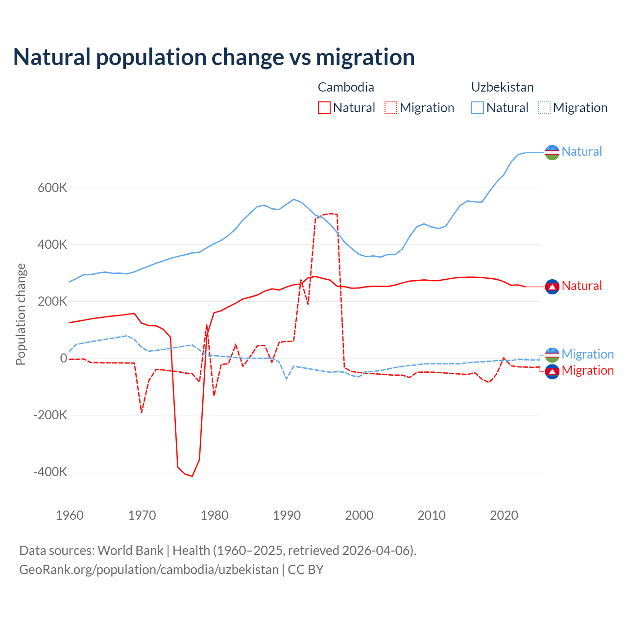 Over the last 10 years, 85.2% of the population change in Cambodia is from natural causes (a gain of 2,724,147 people) and 14.8% is from migration (a loss of 474,505 people). In Uzbekistan 98.2% is from natural causes (a gain of 6,161,117 people) and 1.84% is from migration (a loss of 115,398 people).