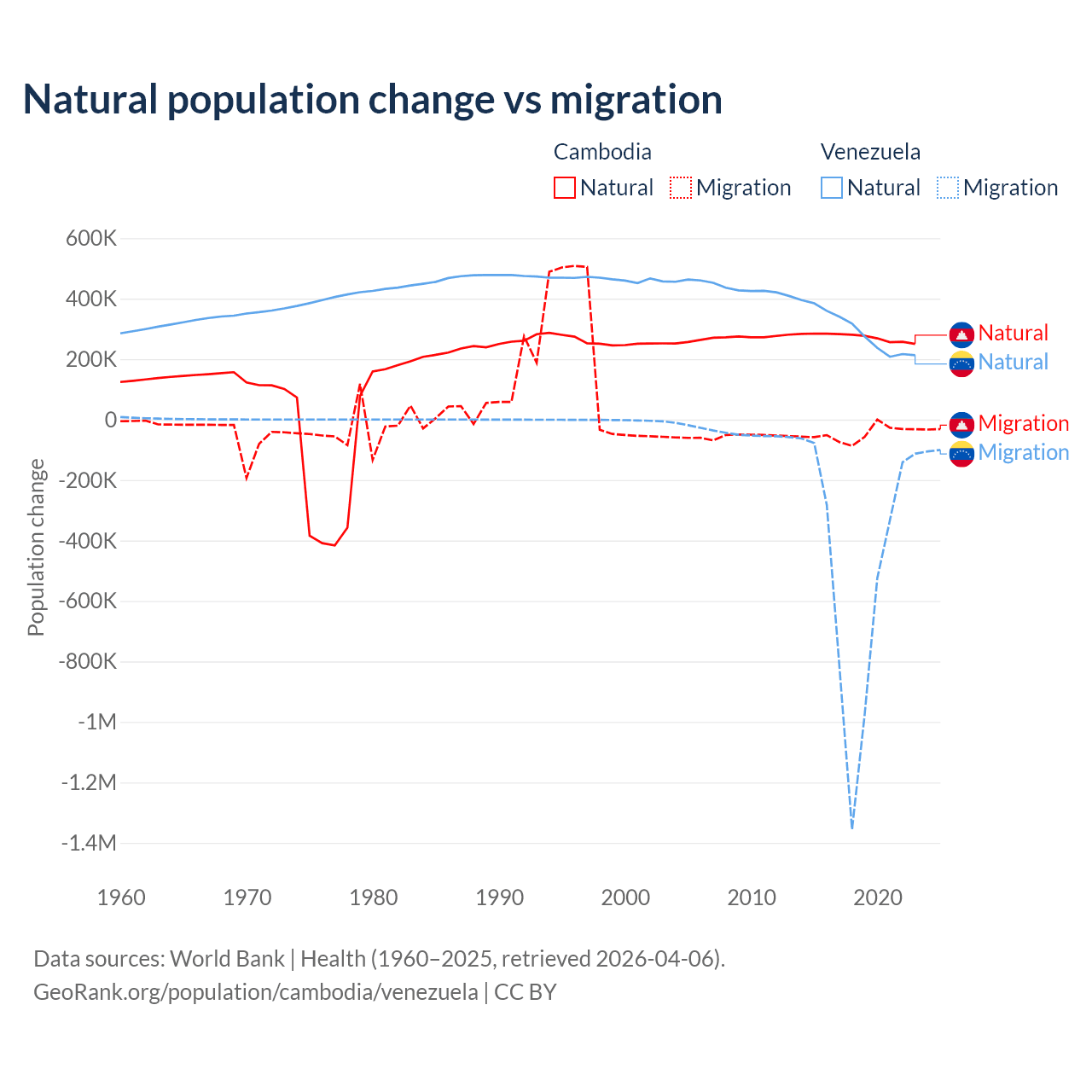 Over the last 10 years, 85.2% of the population change in Cambodia is from natural causes (a gain of 2,724,147 people) and 14.8% is from migration (a loss of 474,505 people). In Venezuela 38.6% is from natural causes (a gain of 2,946,257 people) and 61.4% is from migration (a loss of 4,683,227 people).