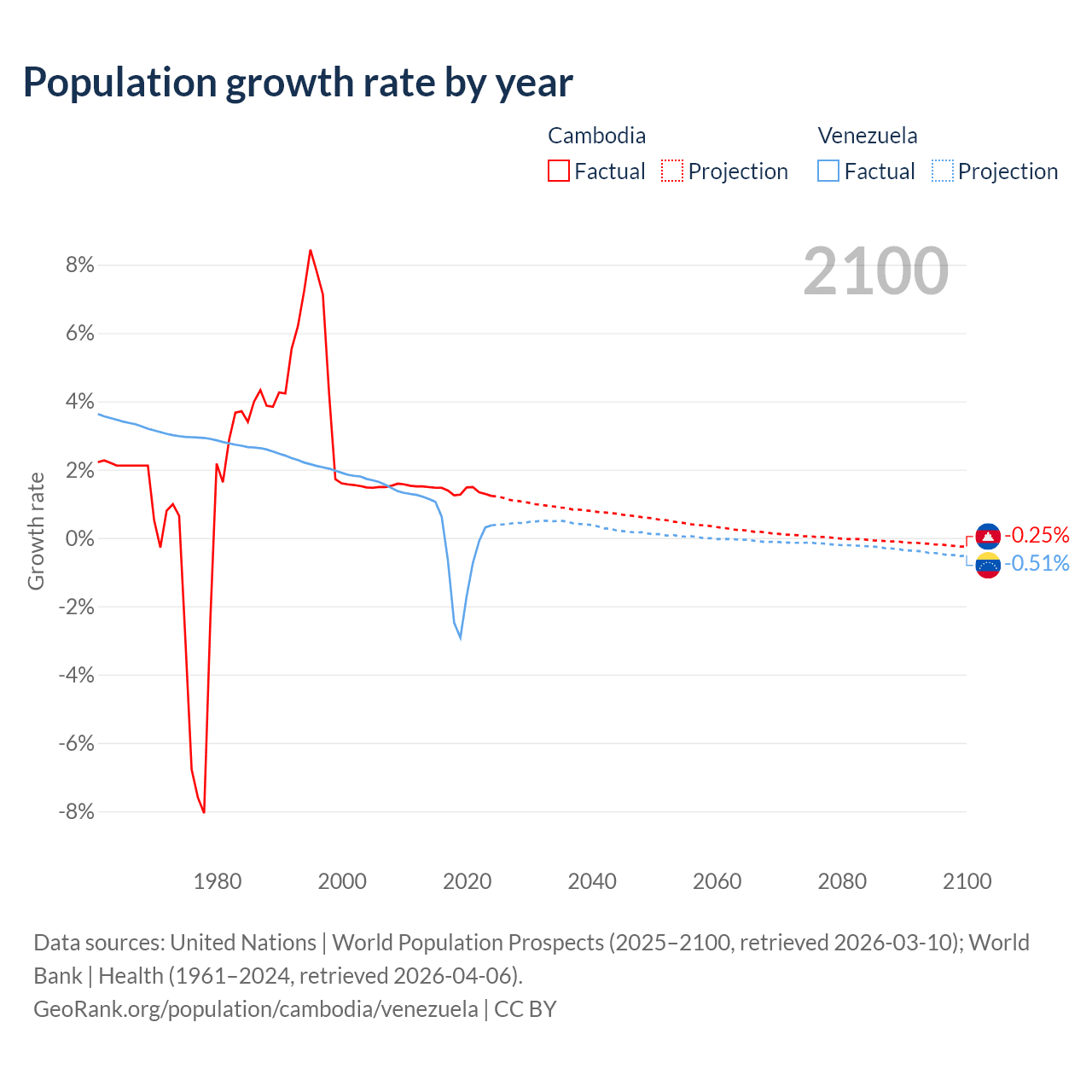 - For the last 10 years, Cambodia has had an average growth rate of +1.38% per year vs -0.46% in Venezuela.