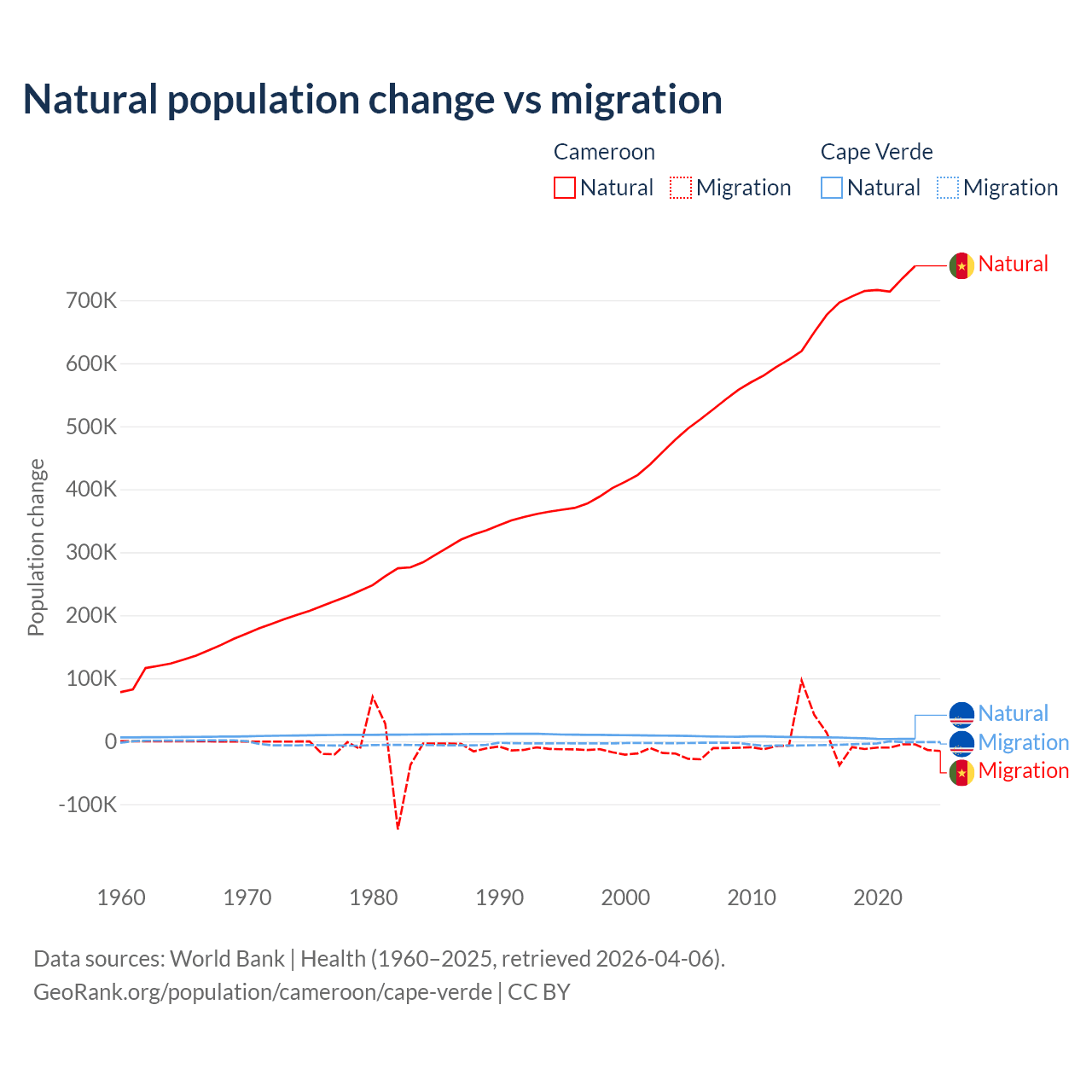 Over the last 10 years, 99.1% of the population change in Cameroon is from natural causes (a gain of 6,982,395 people) and 0.9% is from migration (a gain of 63,139 people). In Cape Verde 56.4% is from natural causes (a gain of 50,193 people) and 43.6% is from migration (a loss of 38,879 people).