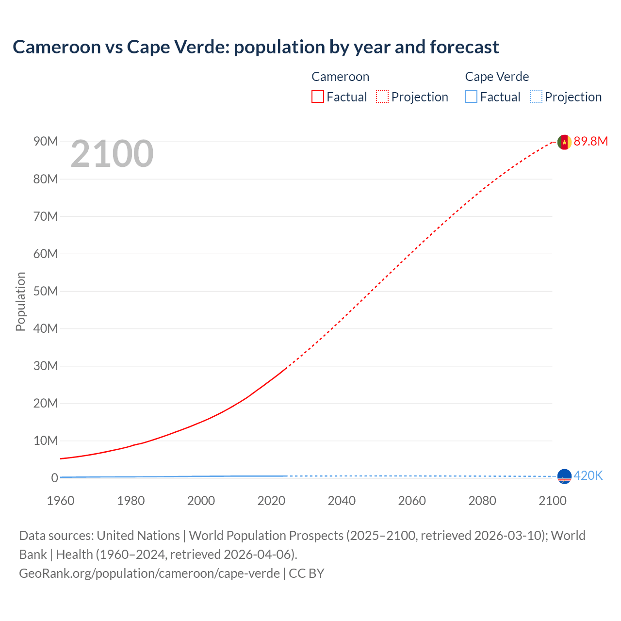 The latest officially reported population of Cameroon was 29,123,744 in 2024 vs 524,877 people in Cape Verde in 2024. In 2026, based on the adjusted UN estimation, the current Cameroon's population is 30,864,115 people compared to 530,391 in Cape Verde.