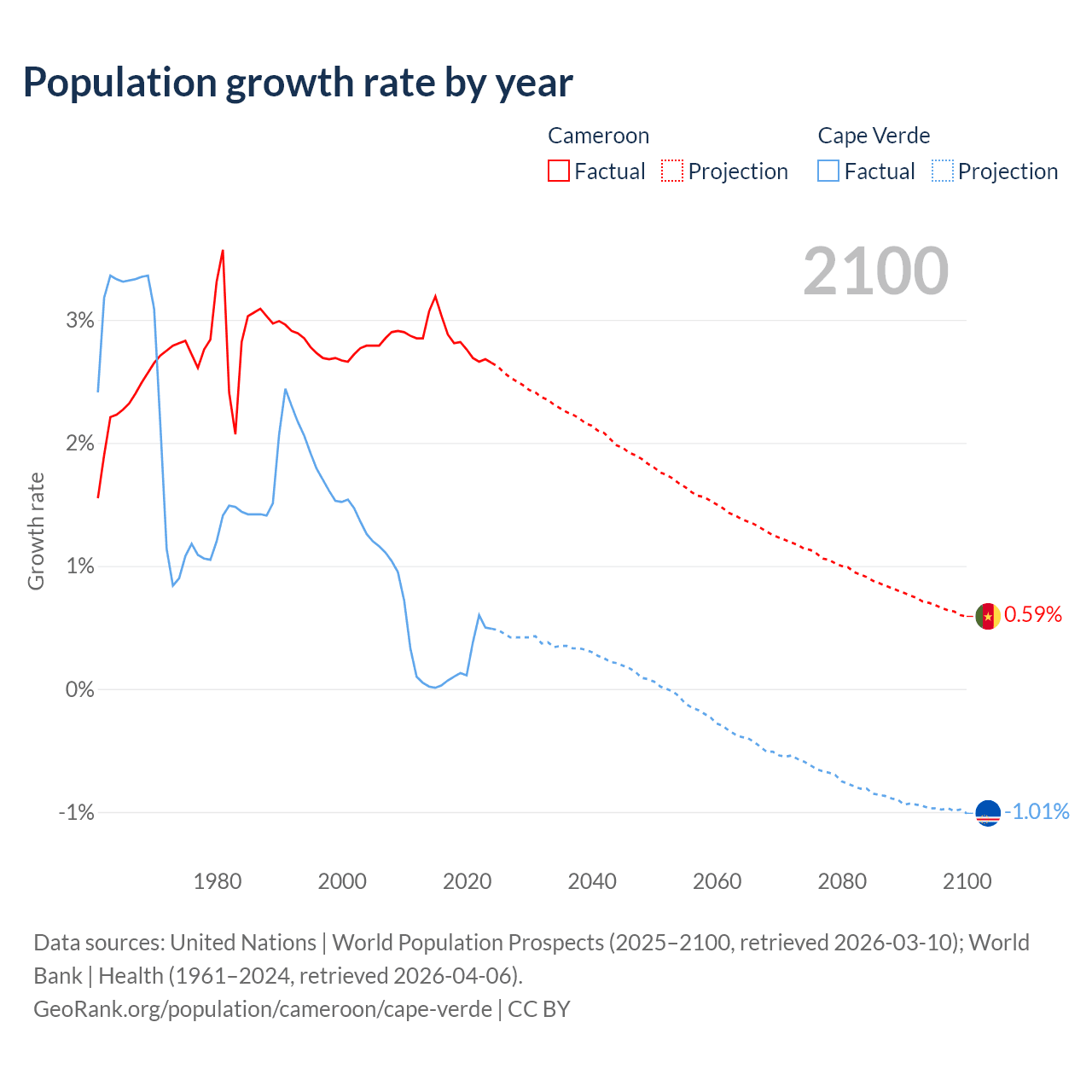 - For the last 10 years, Cameroon has had an average growth rate of +2.84% per year vs +0.22% in Cape Verde.