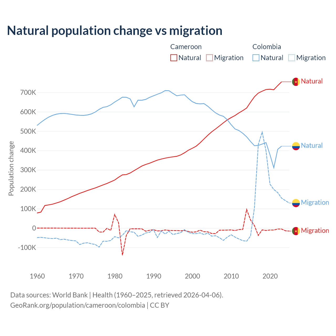 Over the last 10 years, 99.1% of the population change in Cameroon is from natural causes (a gain of 6,982,395 people) and 0.9% is from migration (a gain of 63,139 people). In Colombia 66.6% is from natural causes (a gain of 4,162,856 people) and 33.4% is from migration (a gain of 2,083,051 people).