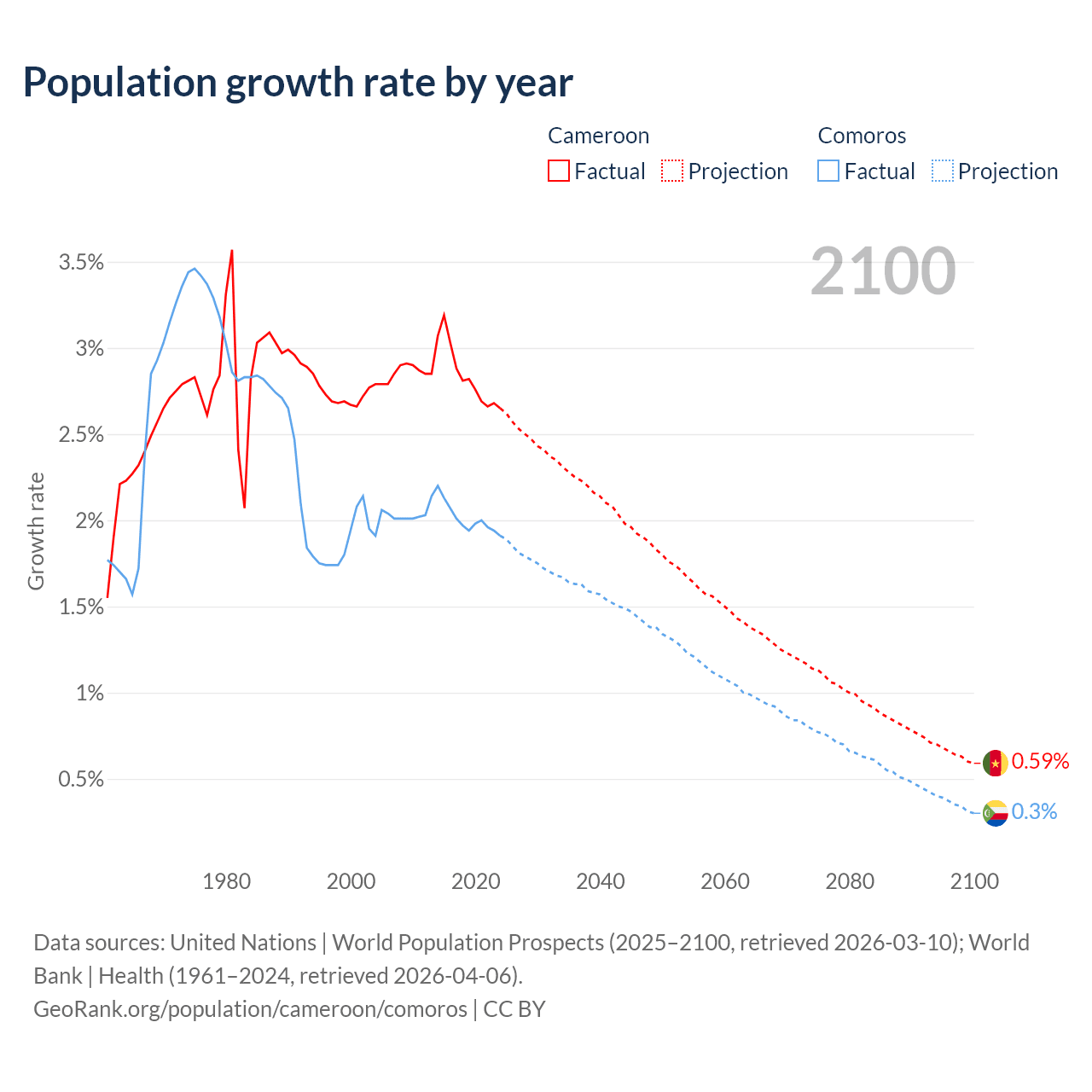 - For the last 10 years, Cameroon has had an average growth rate of +2.84% per year vs +2.01% in Comoros.