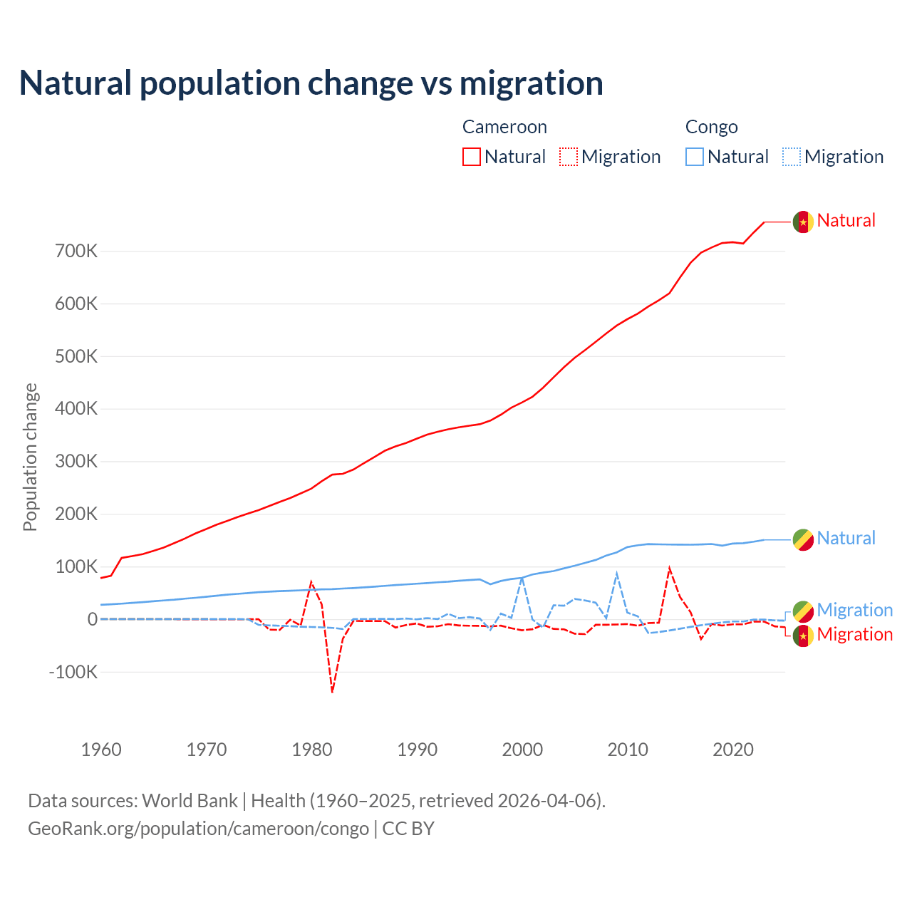 Over the last 10 years, 99.1% of the population change in Cameroon is from natural causes (a gain of 6,982,395 people) and 0.9% is from migration (a gain of 63,139 people). In the Congo 94% is from natural causes (a gain of 1,434,056 people) and 6.04% is from migration (a loss of 92,251 people).