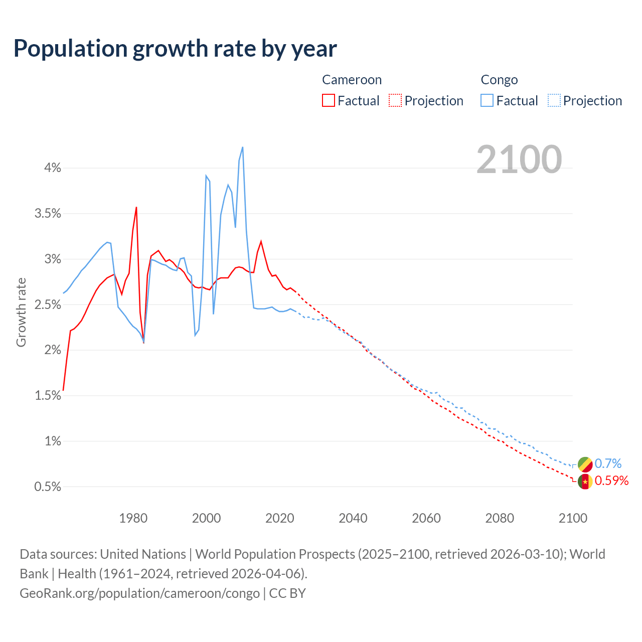 - For the last 10 years, Cameroon has had an average growth rate of +2.84% per year vs +2.44% in the Congo.