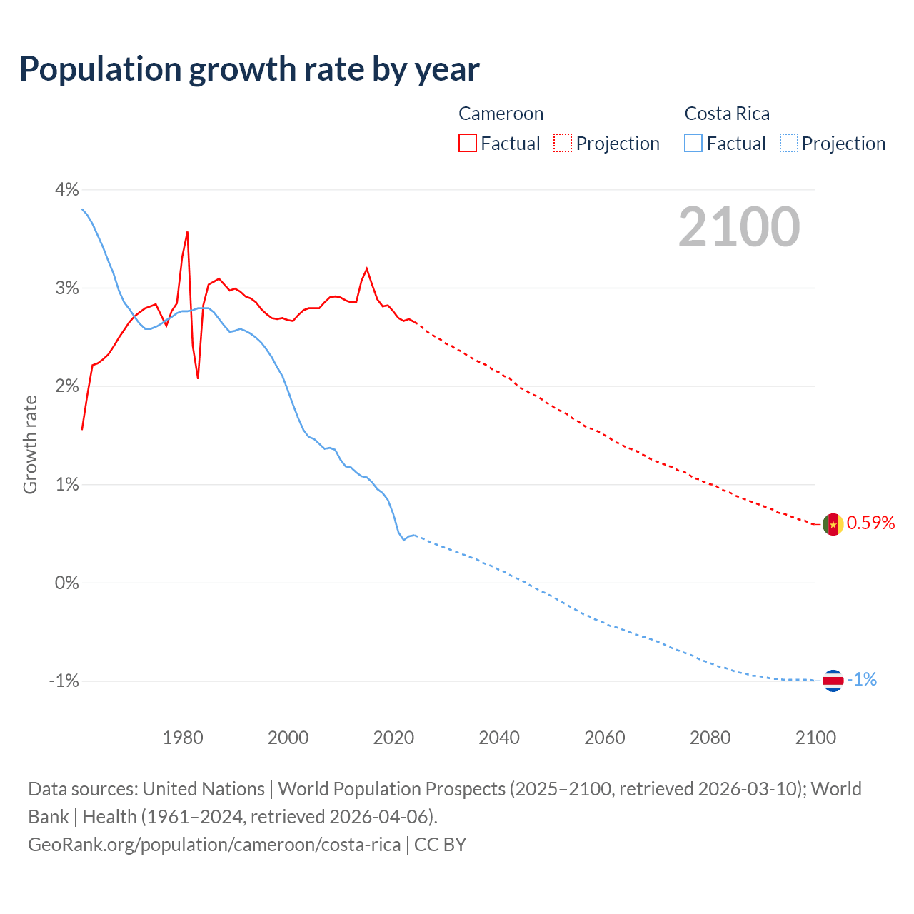 - For the last 10 years, Cameroon has had an average growth rate of +2.84% per year vs +0.77% in Costa Rica.