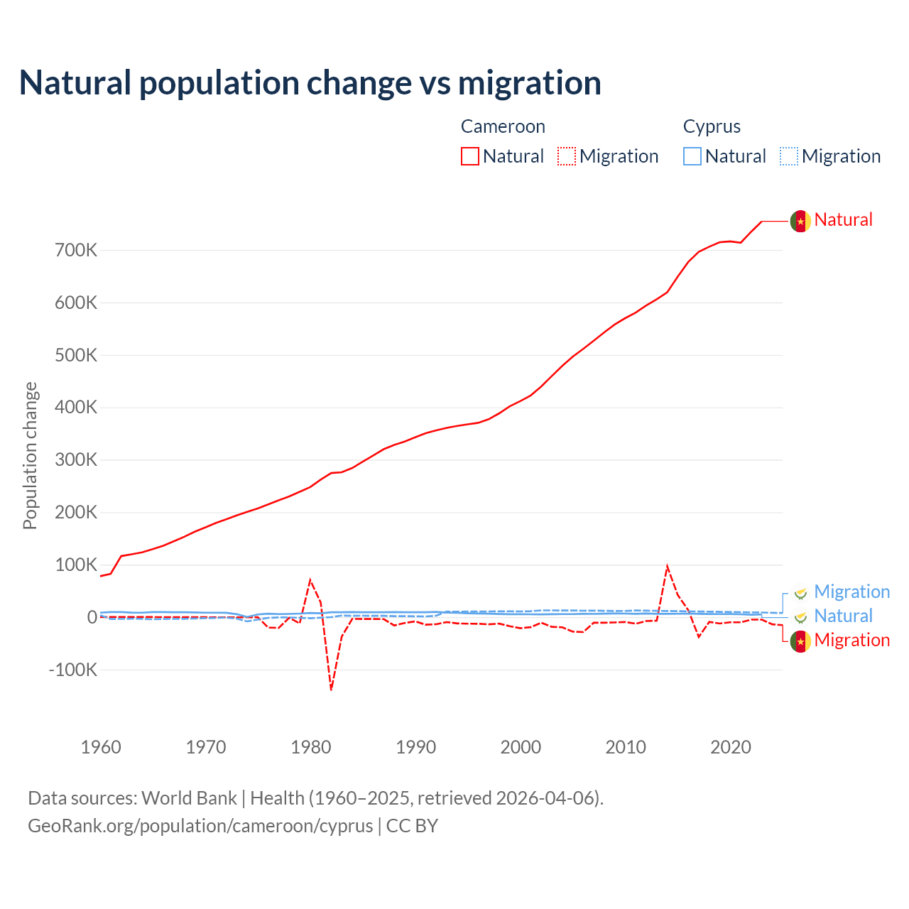 Over the last 10 years, 99.1% of the population change in Cameroon is from natural causes (a gain of 6,982,395 people) and 0.9% is from migration (a gain of 63,139 people). In Cyprus 36.2% is from natural causes (a gain of 57,464 people) and 63.8% is from migration (a gain of 101,458 people).