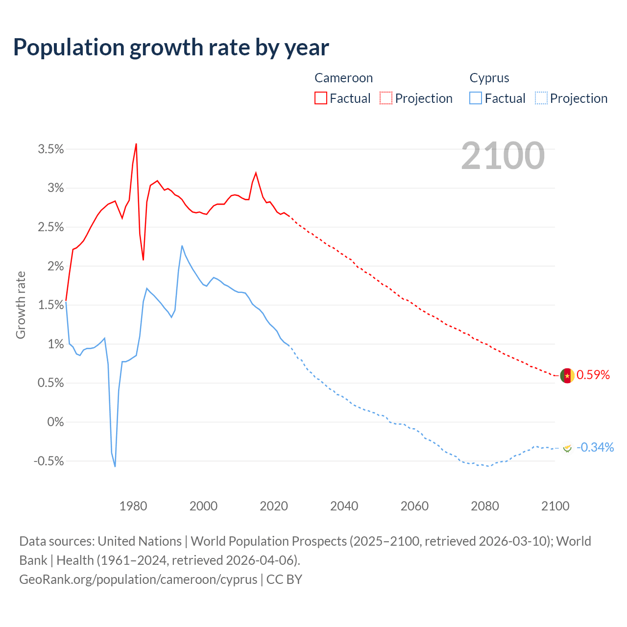 - For the last 10 years, Cameroon has had an average growth rate of +2.84% per year vs +1.26% in Cyprus.
