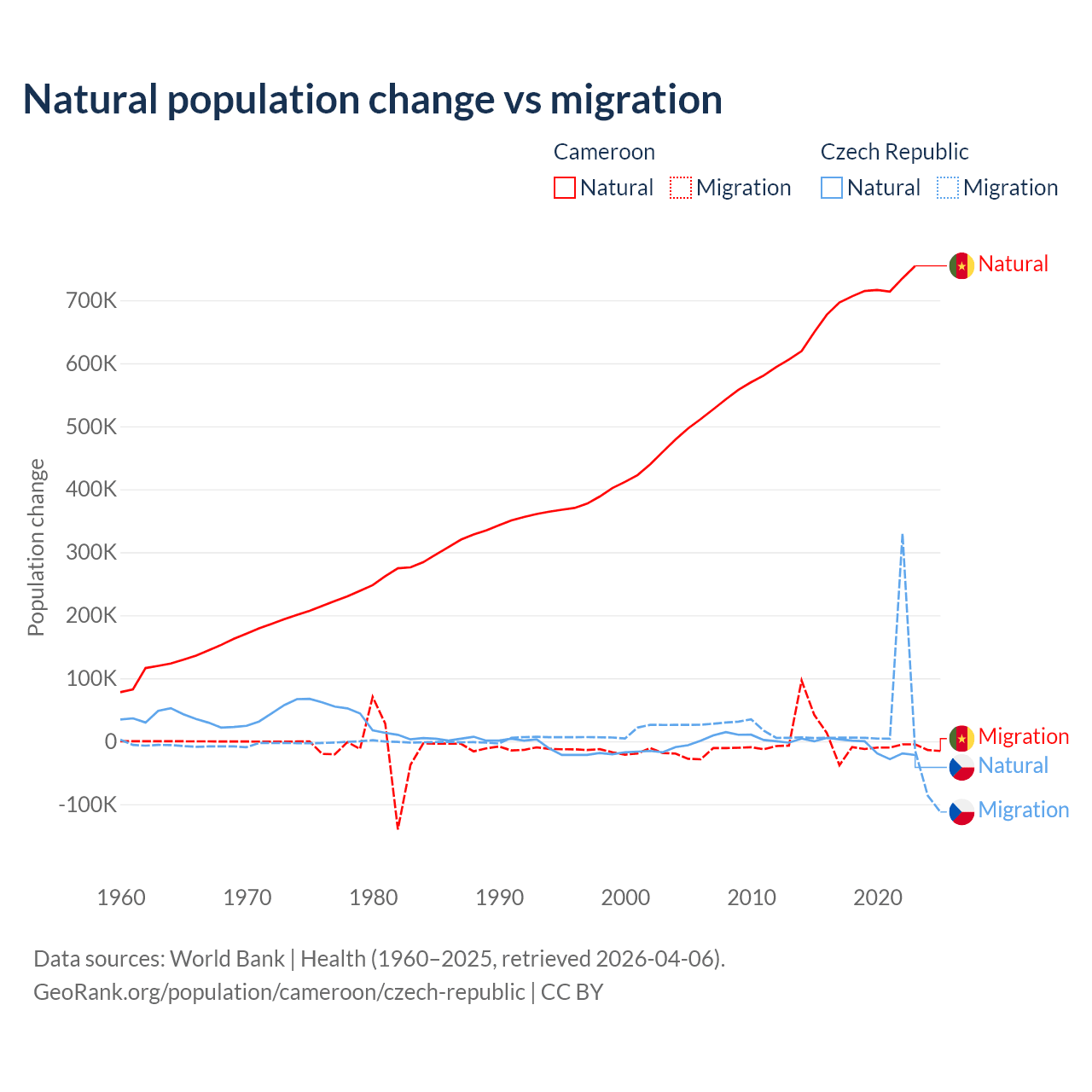 Over the last 10 years, 99.1% of the population change in Cameroon is from natural causes (a gain of 6,982,395 people) and 0.9% is from migration (a gain of 63,139 people). In the Czech Republic 17.3% is from natural causes (a loss of 74,826 people) and 82.7% is from migration (a gain of 357,502 people).