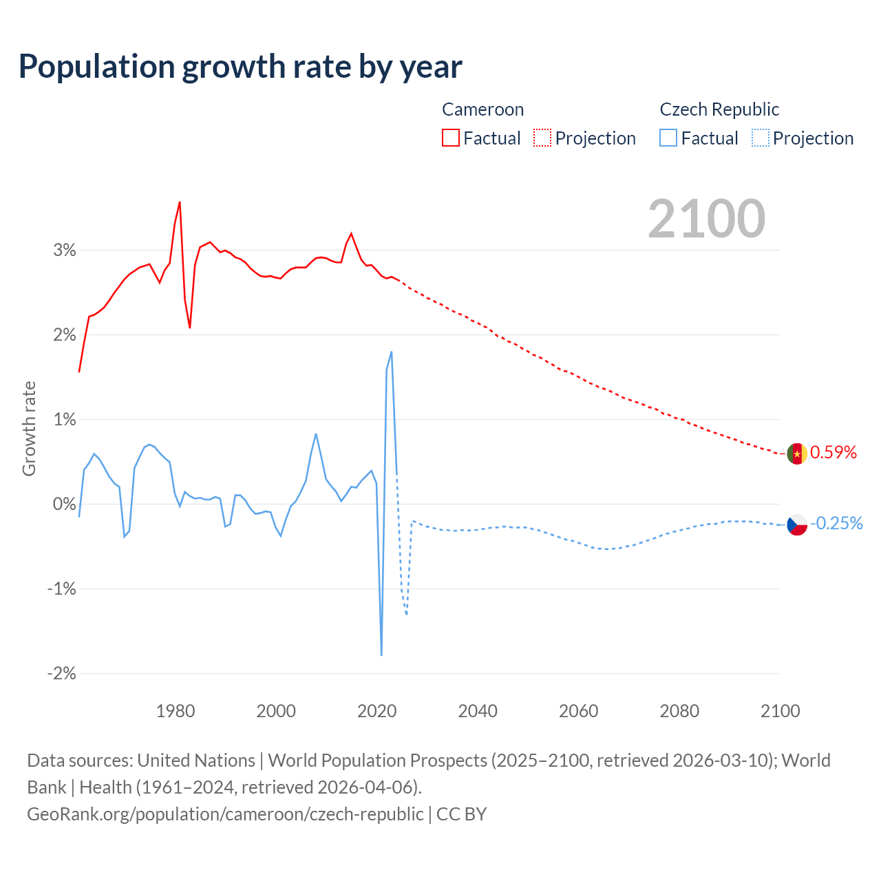 - For the last 10 years, Cameroon has had an average growth rate of +2.84% per year vs +0.34% in the Czech Republic.