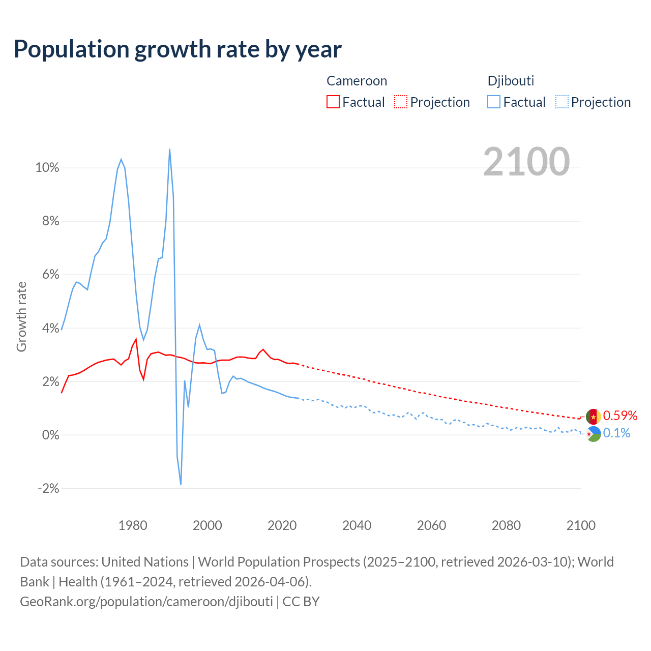 - For the last 10 years, Cameroon has had an average growth rate of +2.84% per year vs +1.57% in Djibouti.