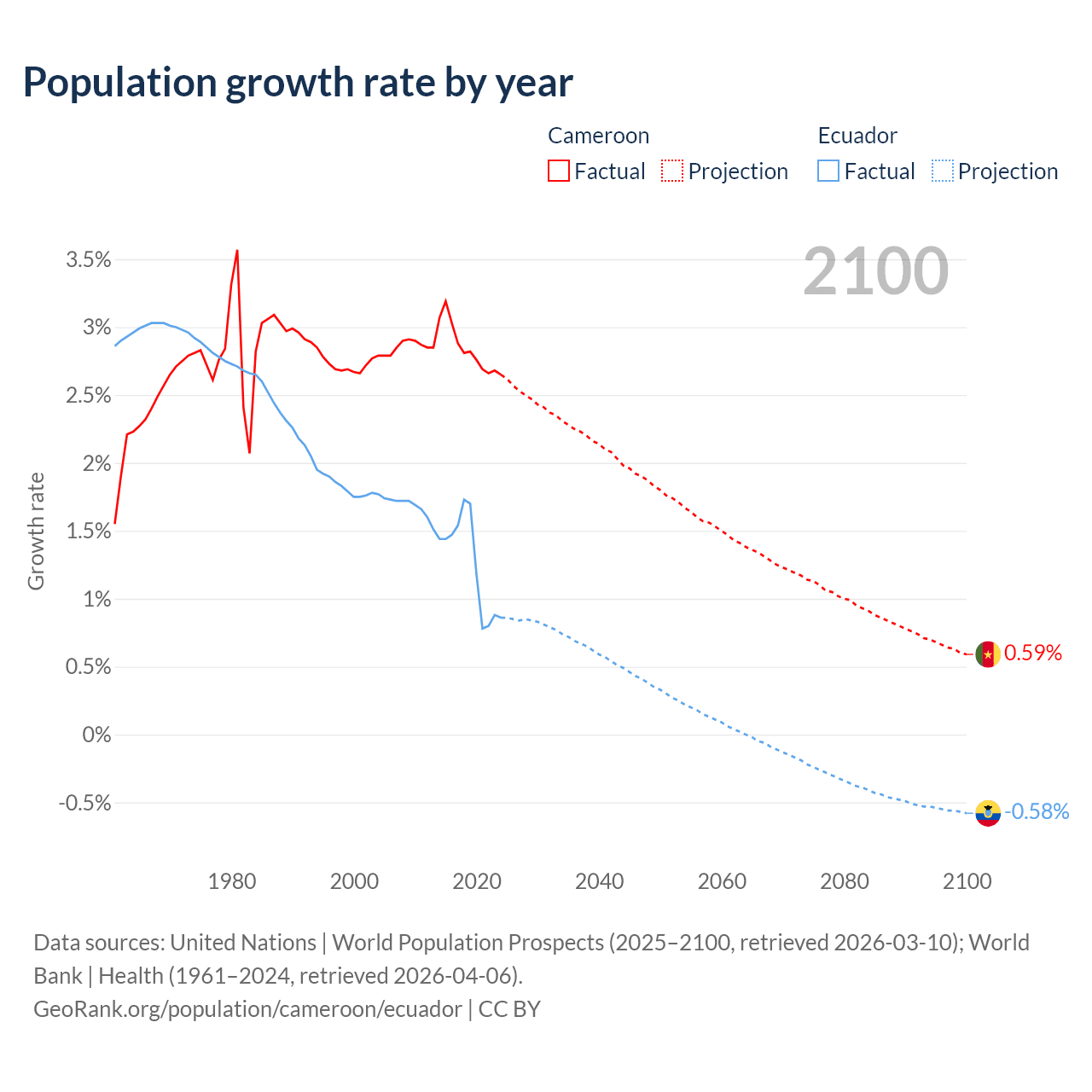 - For the last 10 years, Cameroon has had an average growth rate of +2.84% per year vs +1.26% in Ecuador.