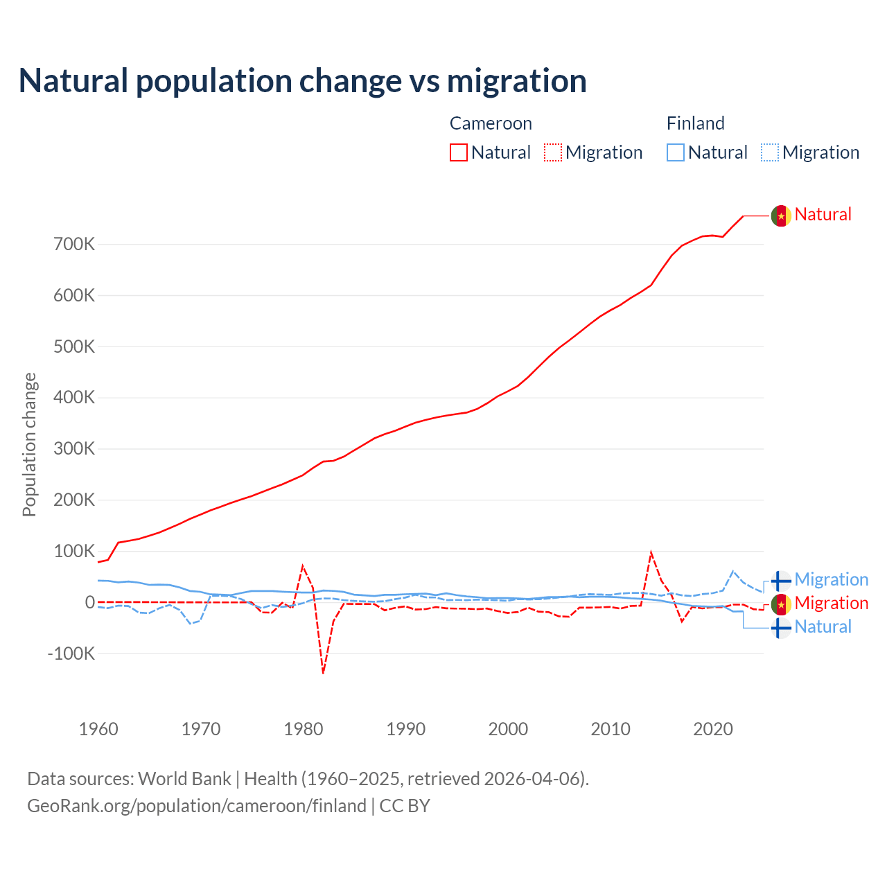 Over the last 10 years, 99.1% of the population change in Cameroon is from natural causes (a gain of 6,982,395 people) and 0.9% is from migration (a gain of 63,139 people). In Finland 22.5% is from natural causes (a loss of 65,560 people) and 77.5% is from migration (a gain of 225,237 people).