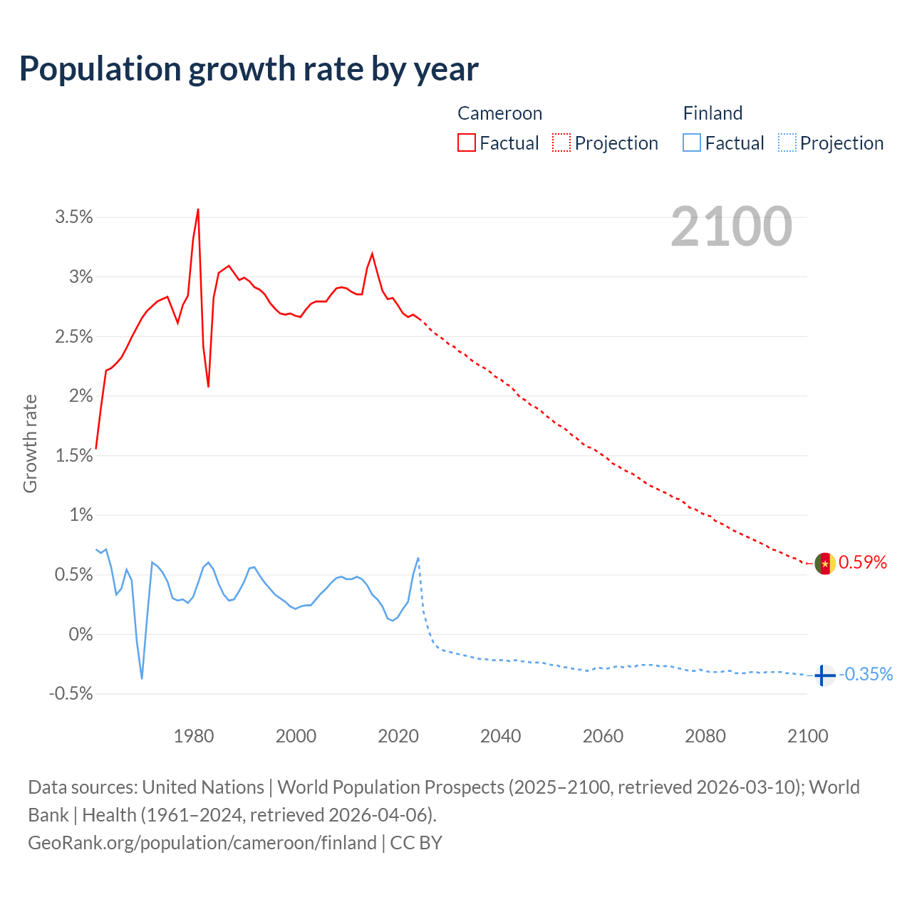 - For the last 10 years, Cameroon has had an average growth rate of +2.84% per year vs +0.3% in Finland.