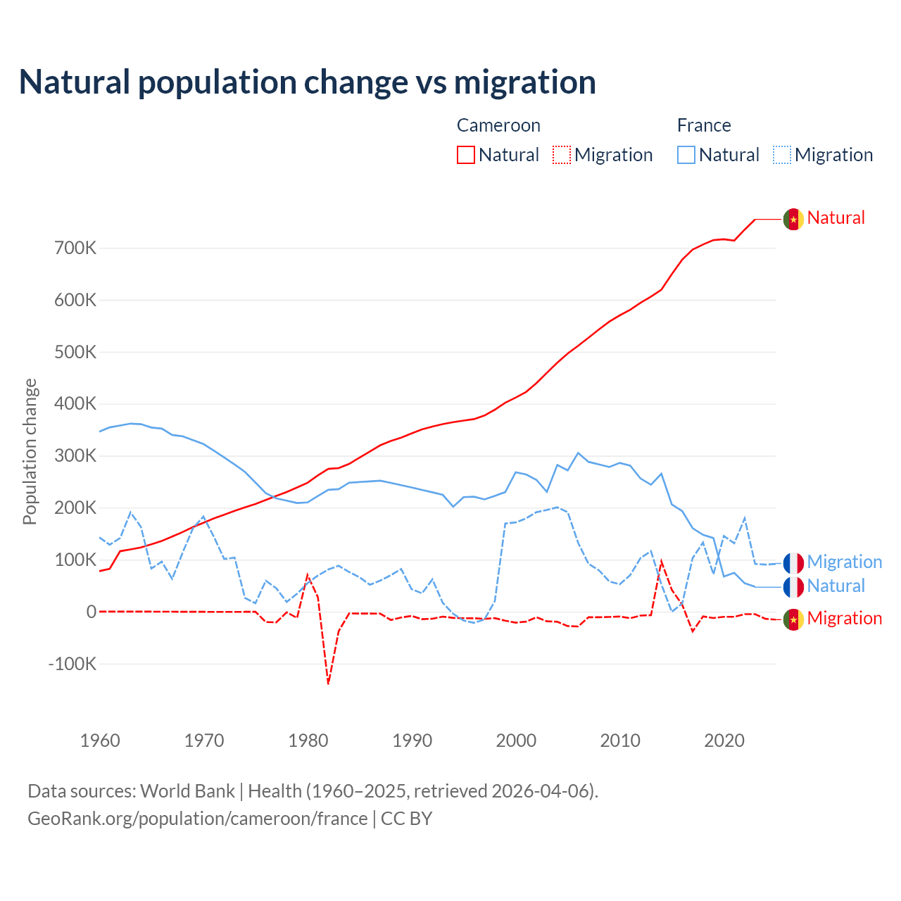 Over the last 10 years, 99.1% of the population change in Cameroon is from natural causes (a gain of 6,982,395 people) and 0.9% is from migration (a gain of 63,139 people). In France 59.5% is from natural causes (a gain of 1,359,540 people) and 40.5% is from migration (a gain of 923,723 people).