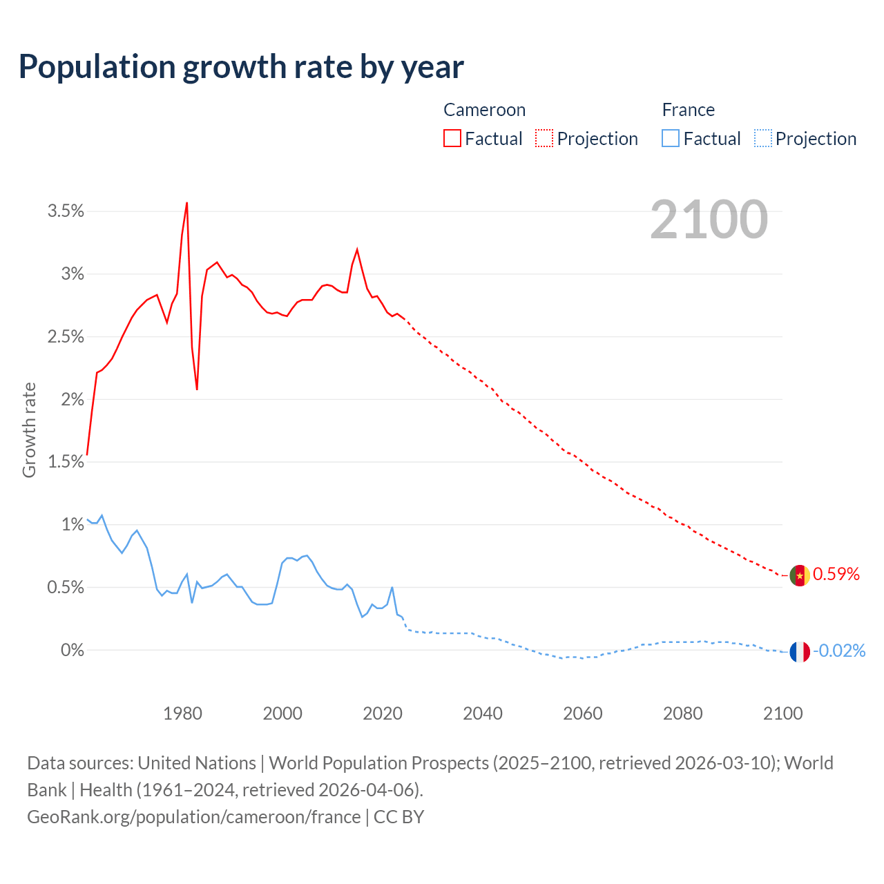 Cameroon vs France: population by year and forecast