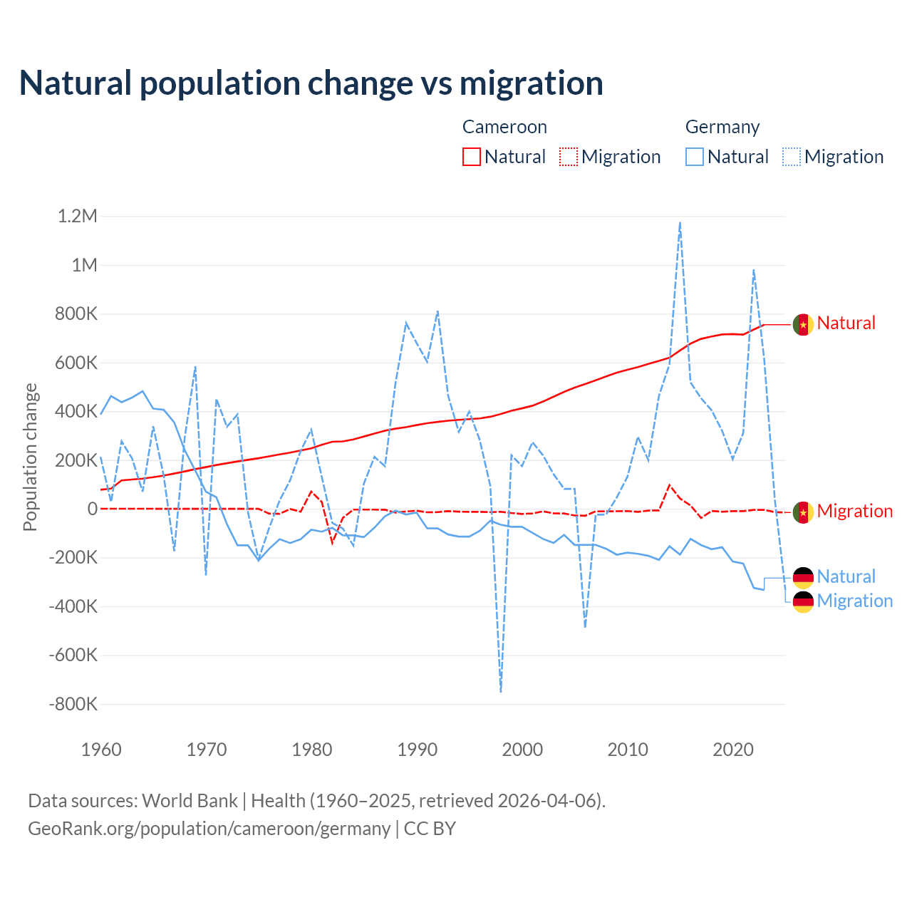 Over the last 10 years, 99.1% of the population change in Cameroon is from natural causes (a gain of 6,982,395 people) and 0.9% is from migration (a gain of 63,139 people). In Germany 26.8% is from natural causes (a loss of 2,036,130 people) and 73.2% is from migration (a gain of 5,565,916 people).