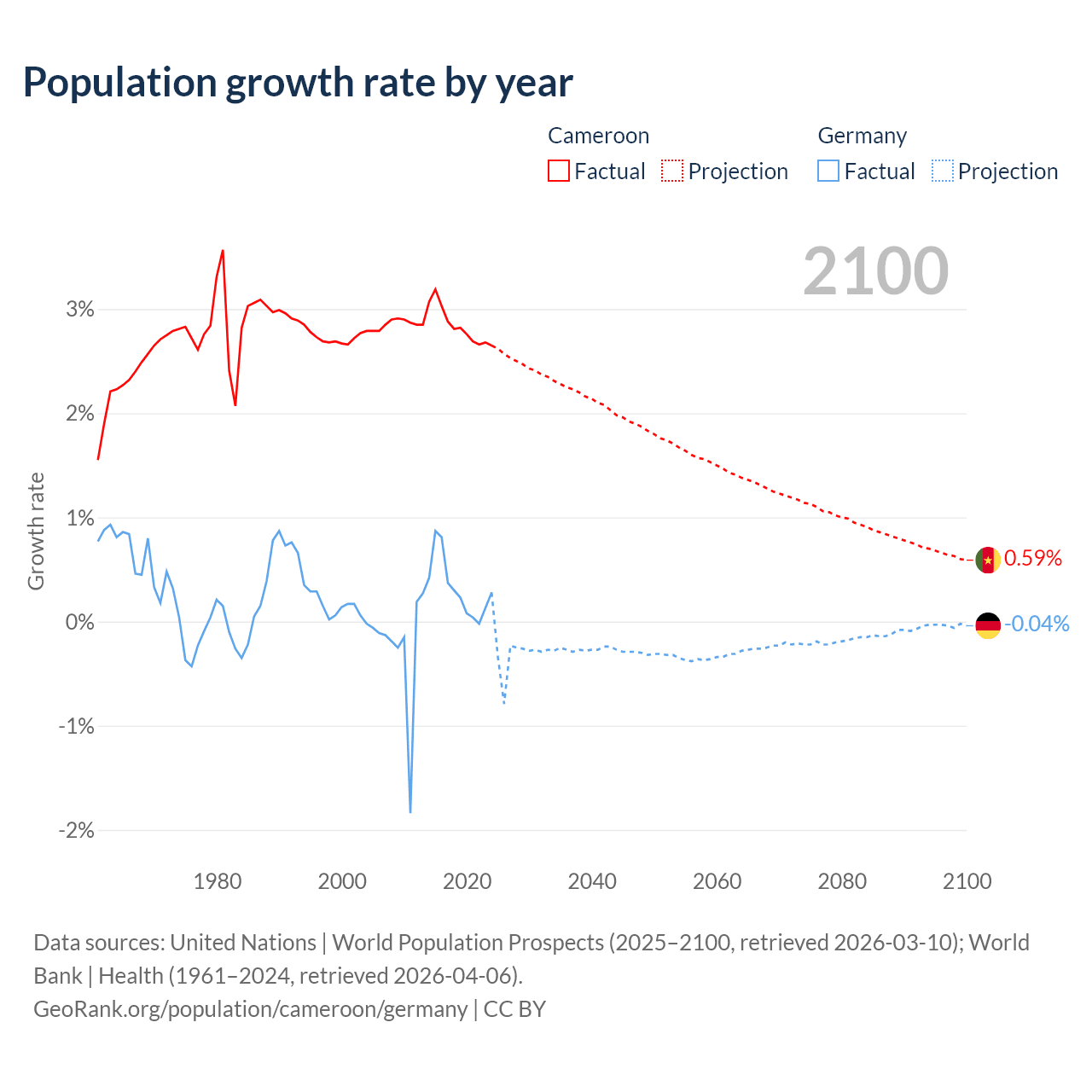 - For the last 10 years, Cameroon has had an average growth rate of +2.84% per year vs +0.32% in Germany.